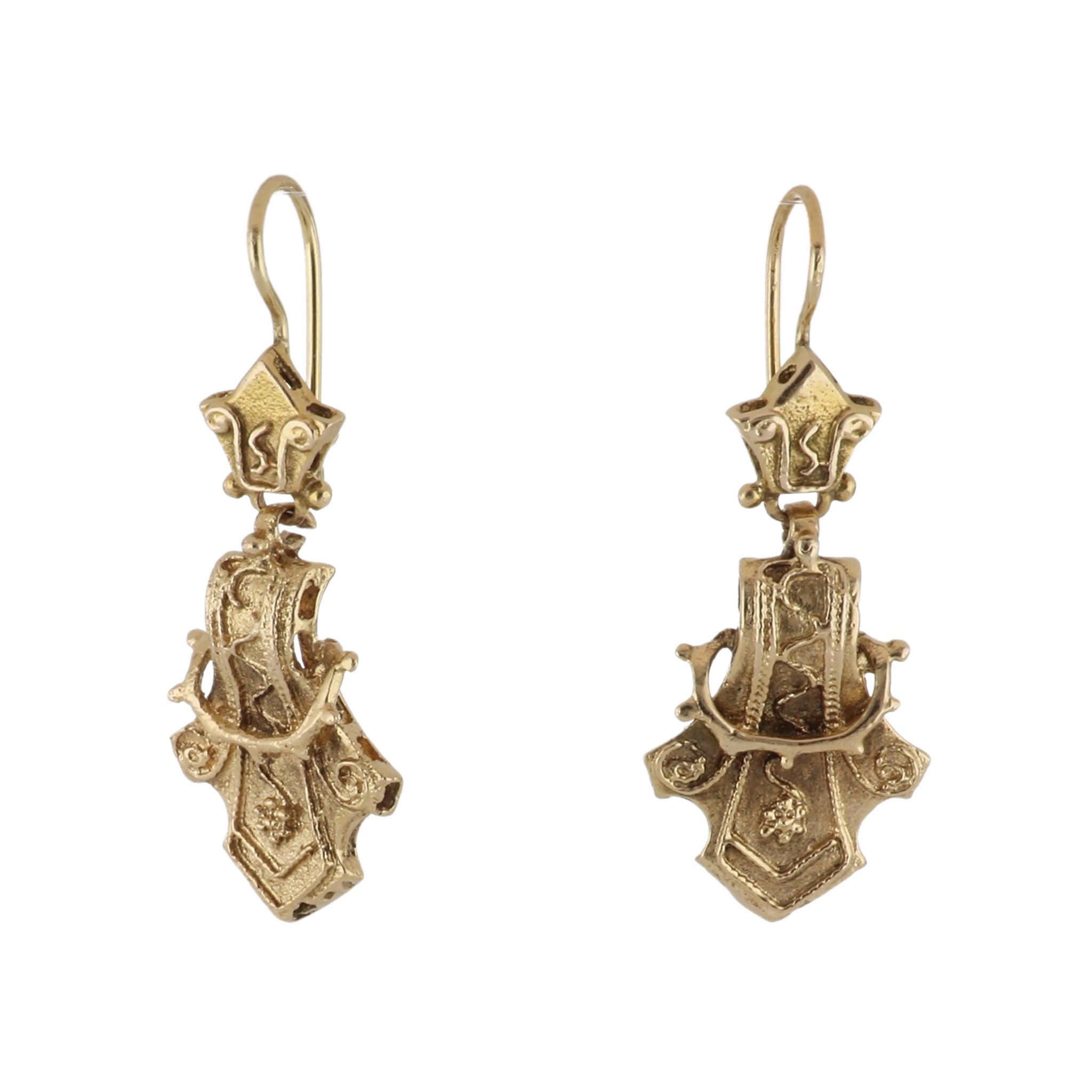 A pair of antique Mid-Century 14K yellow gold drop earrings.