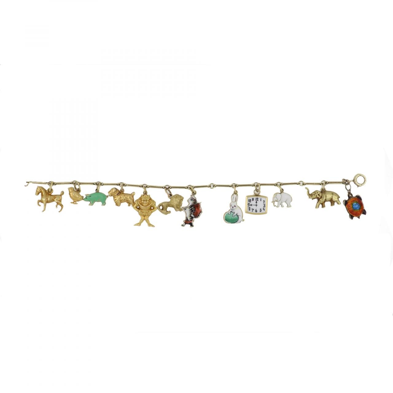 A mid-century multi animal charm bracelet with enamel, set in 14k yellow gold. Circa 1960.