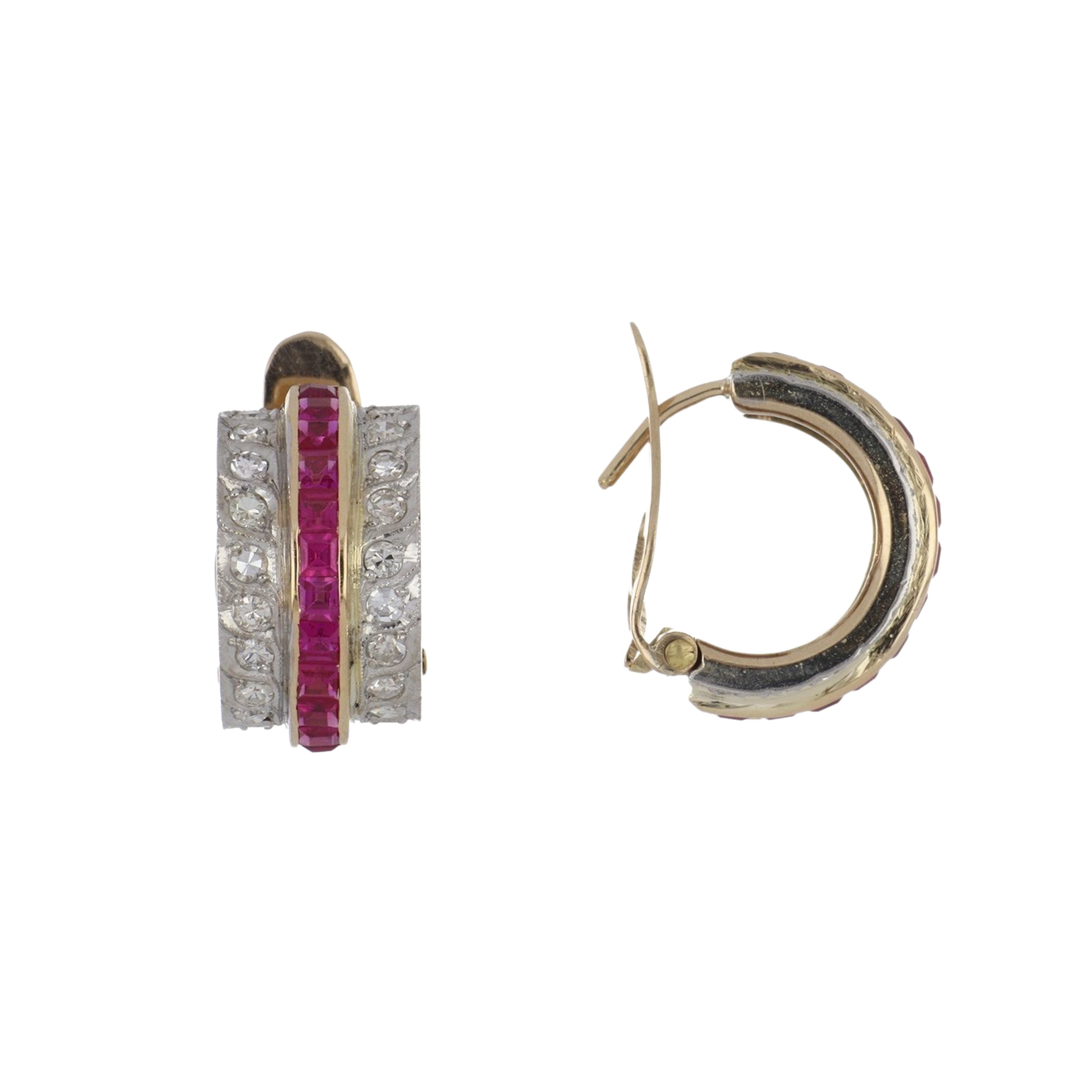 A pair of Mid-Century calibre-cut ruby and single-cut diamond huggie earrings, set in platinum and 18K yellow gold. Circa 1950.
