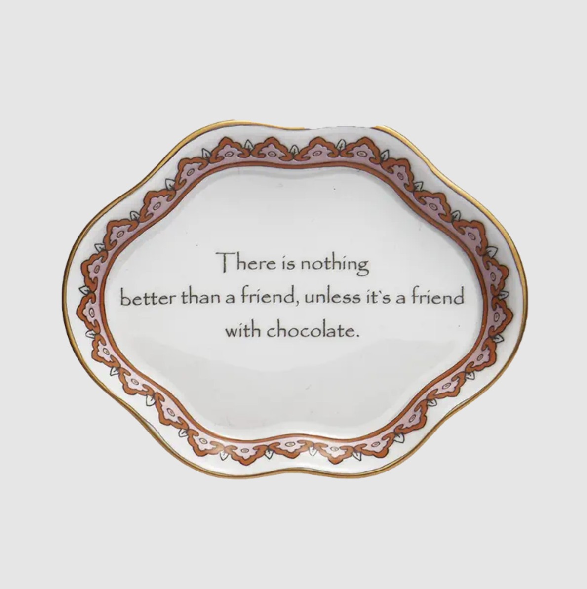 A Mottahedeh "There is nothing better than a friend, unless it's a friend with chocolate." porcelain tray in orange and white.
