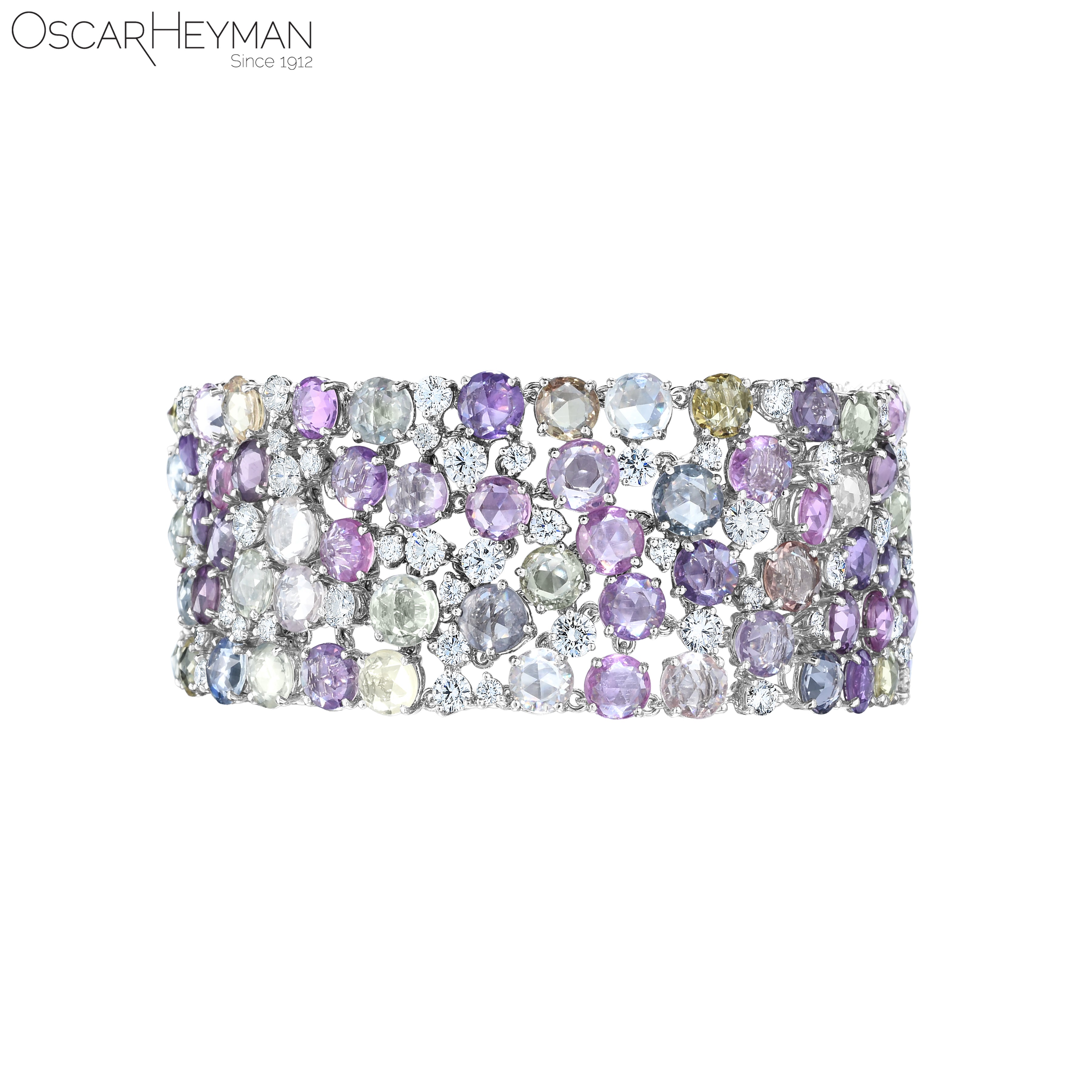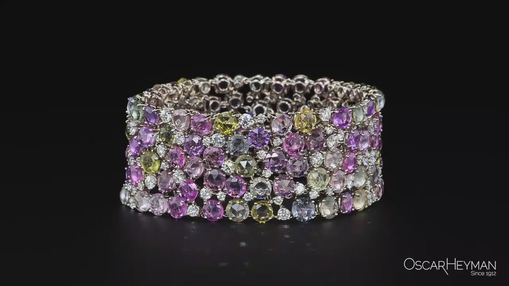 An Oscar Heyman bracelet composed of rose-cut, multi-colored sapphires (unheated) and diamonds, set in platinum. Signed: Oscar Heyman.
