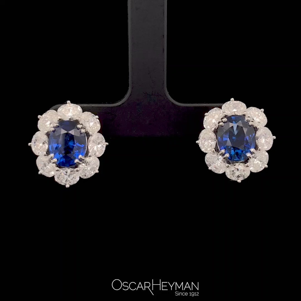 A pair of Oscar Heyman cluster earrings featuring oval Ceylon sapphires framed by oval-cut diamonds, set in platinum. Signed: Oscar Heyman.