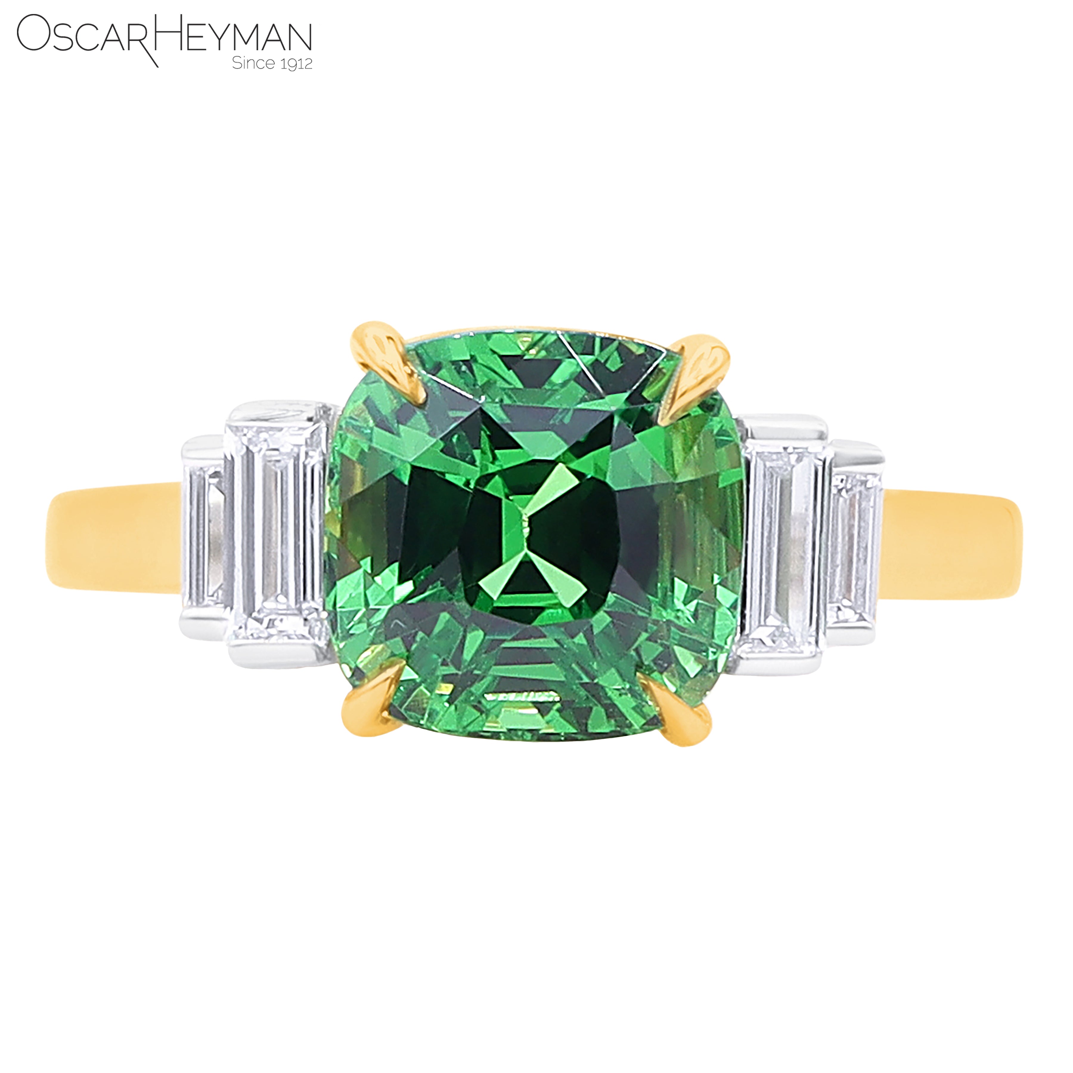 An Oscar Heyman ring featuring a cushion-cut tsavorite garnet and baguette diamond side stones, set in 18K yellow gold and platinum. Signed: Oscar Heyman.