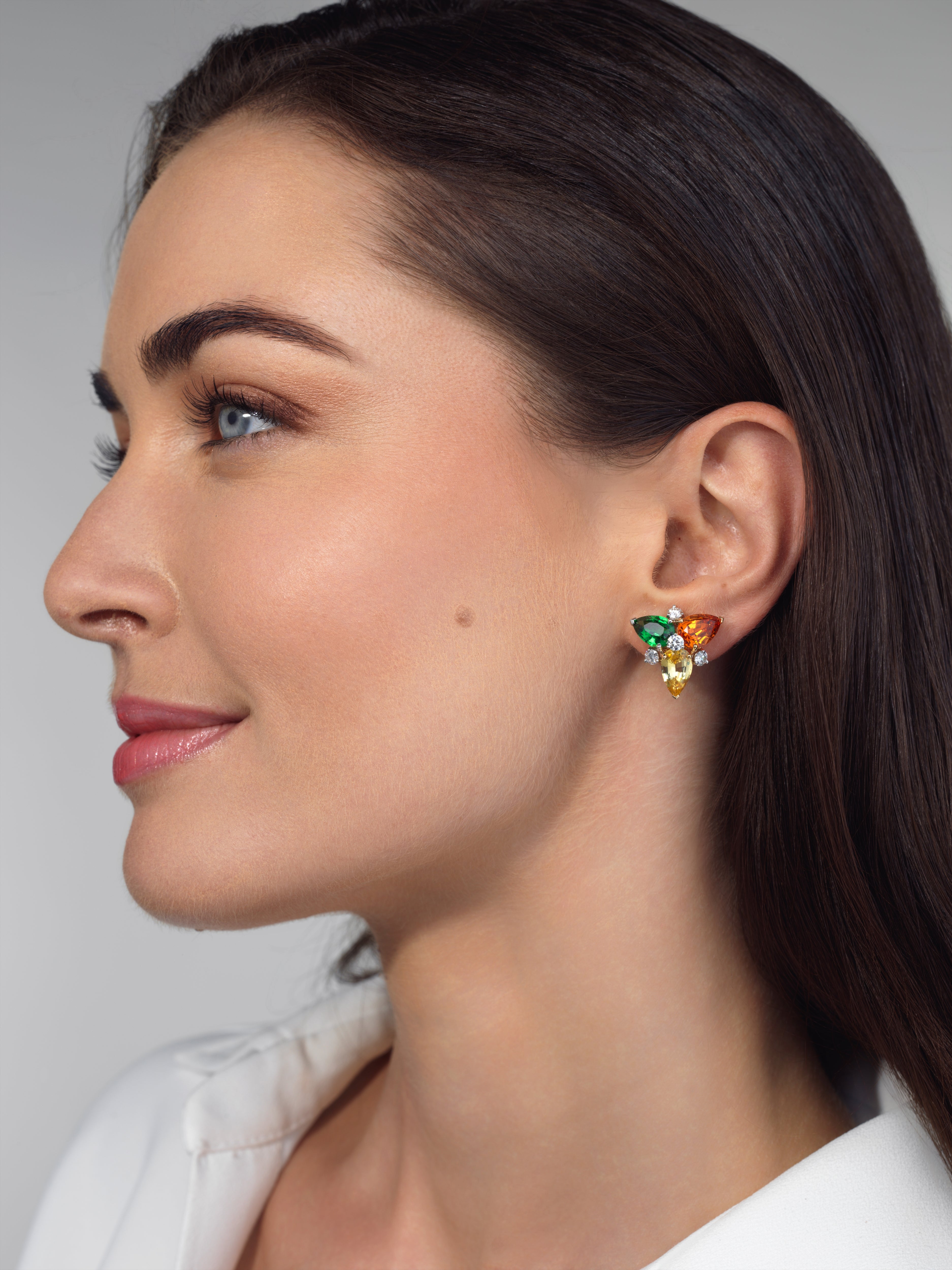 A pair of important Oscar Heyman cluster earrings featuring spessartite garnets, tsavorite garnets, yellow sapphires and diamonds set in 18K yellow gold and platinum. Signed: Oscar Heyman.