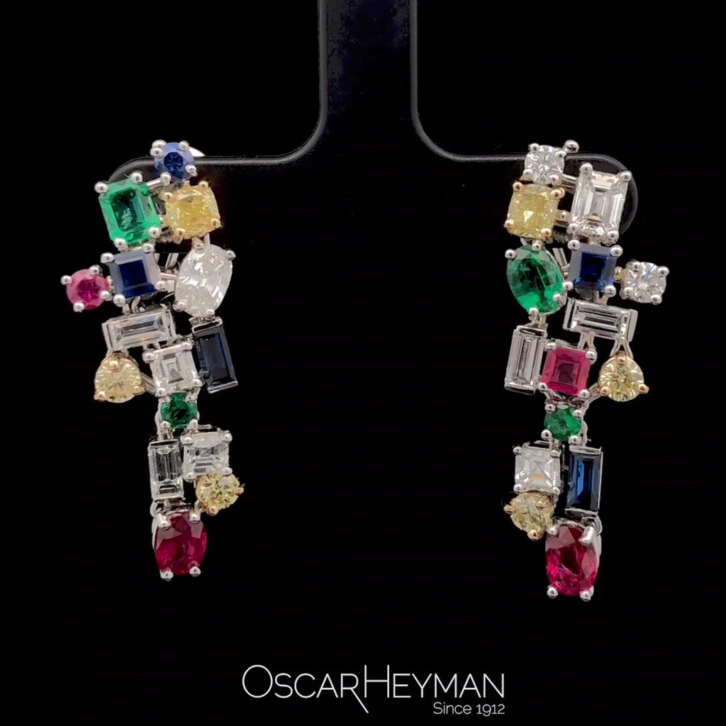 A pair of Oscar Heyman cascade earrings featuring multi-colored gemstones and diamonds, set in 18K yellow gold and platinum. Signed: Oscar Heyman.