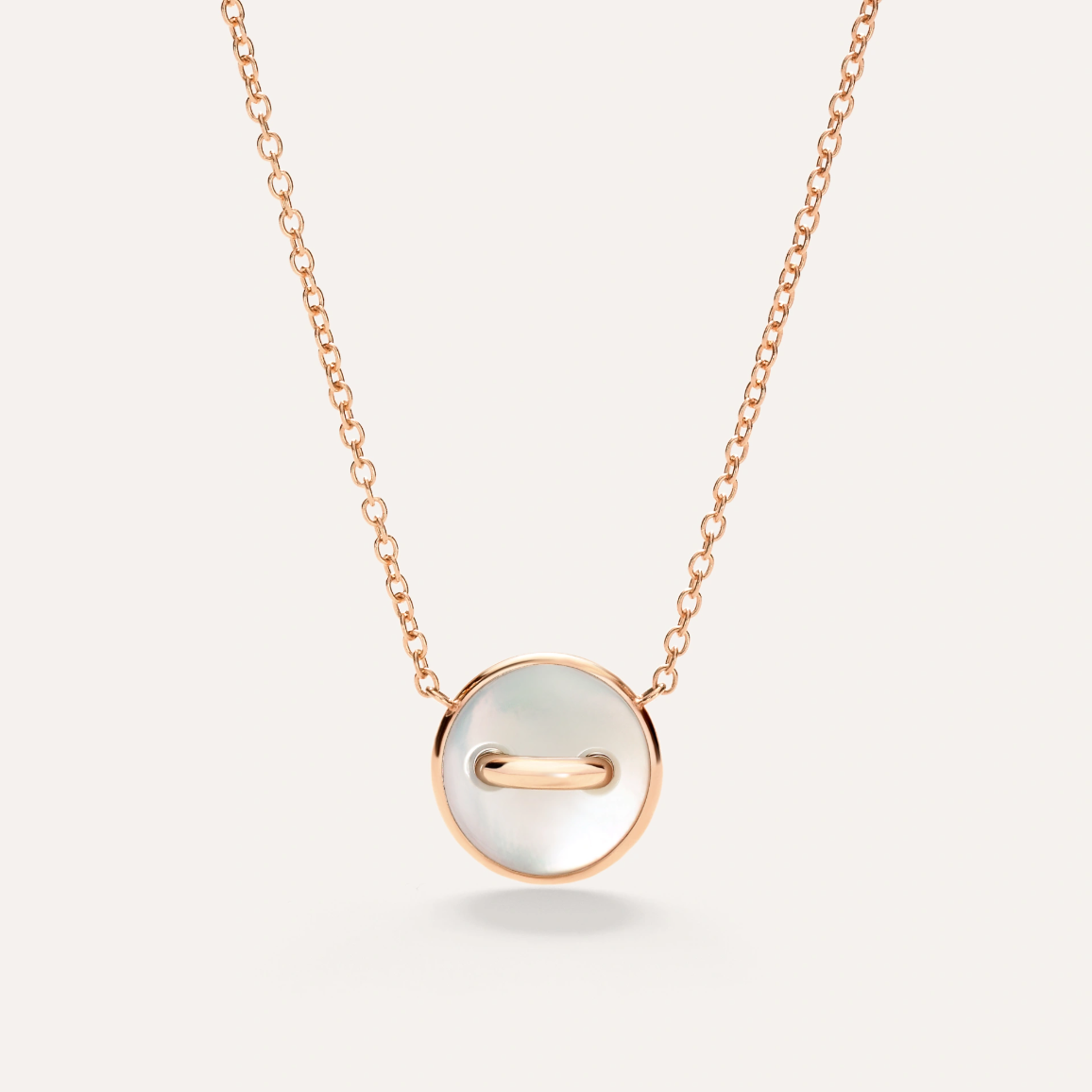 A Pomellato white mother-of-pearl and pave round brilliant-cut diamond Pom Pom Dot reversible pendant necklace, set in 18K rose gold. Made in Italy.