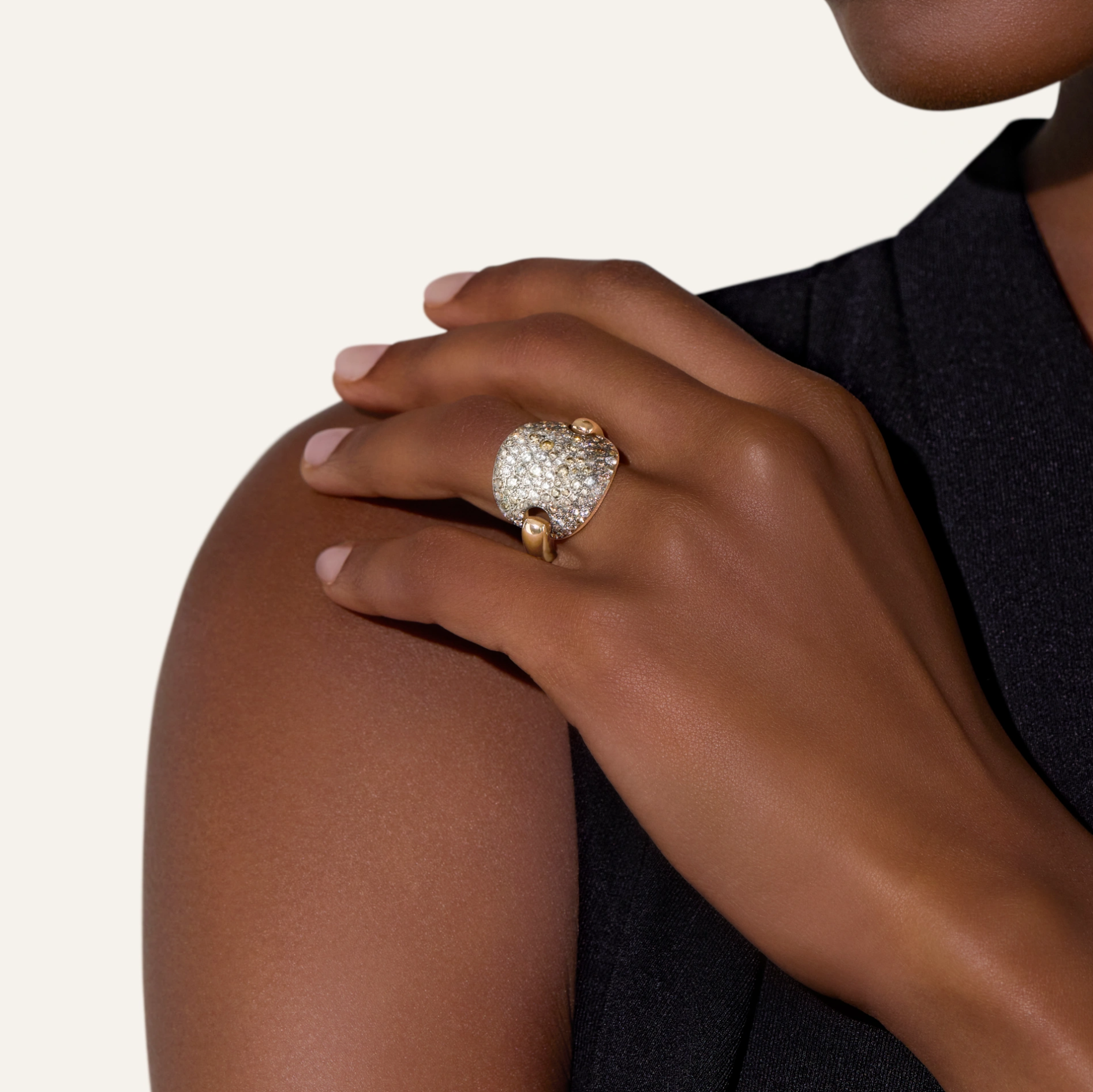 A Pomellato Sabbia ring with brown and white diamonds, set in 18K rose gold.