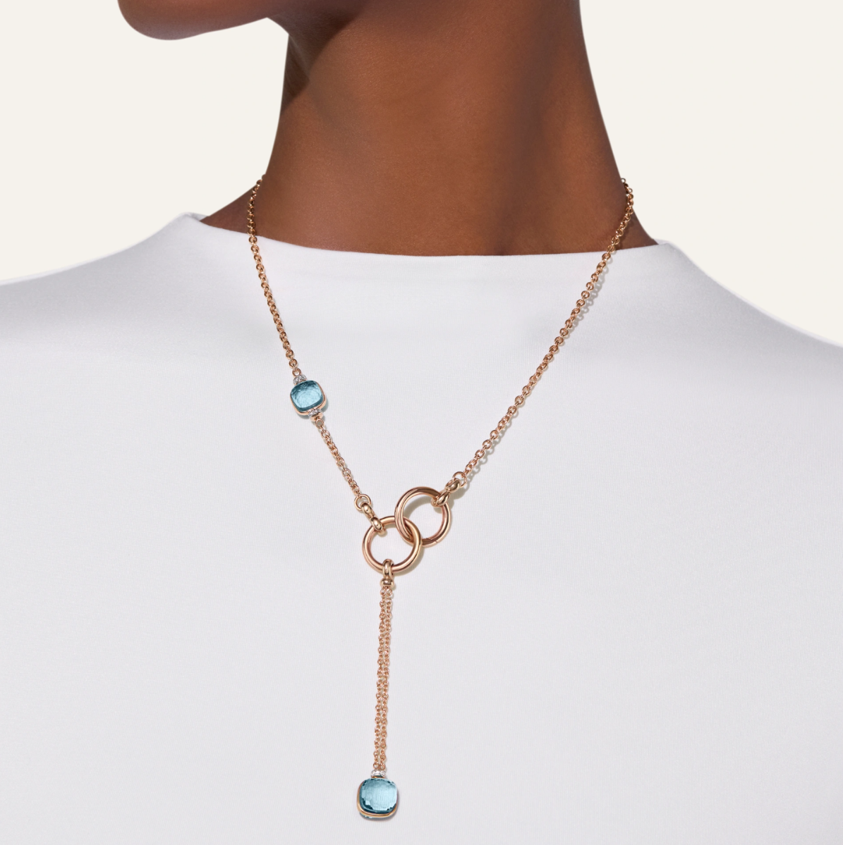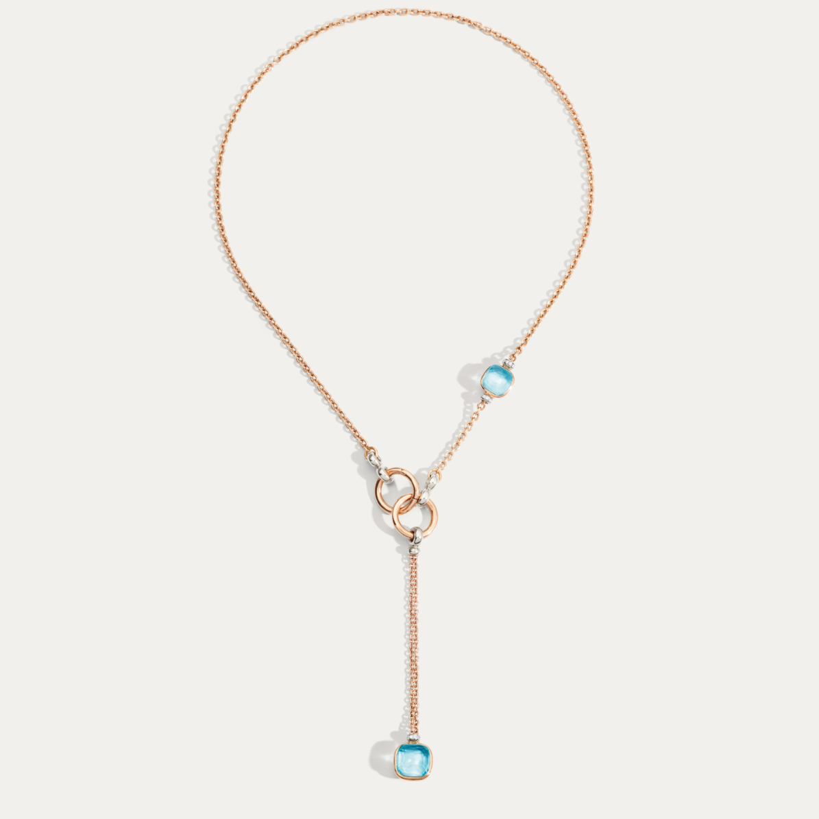 A Pomellato sky blue topaz Nudo necklace with diamonds, set in 18K rose and white gold.