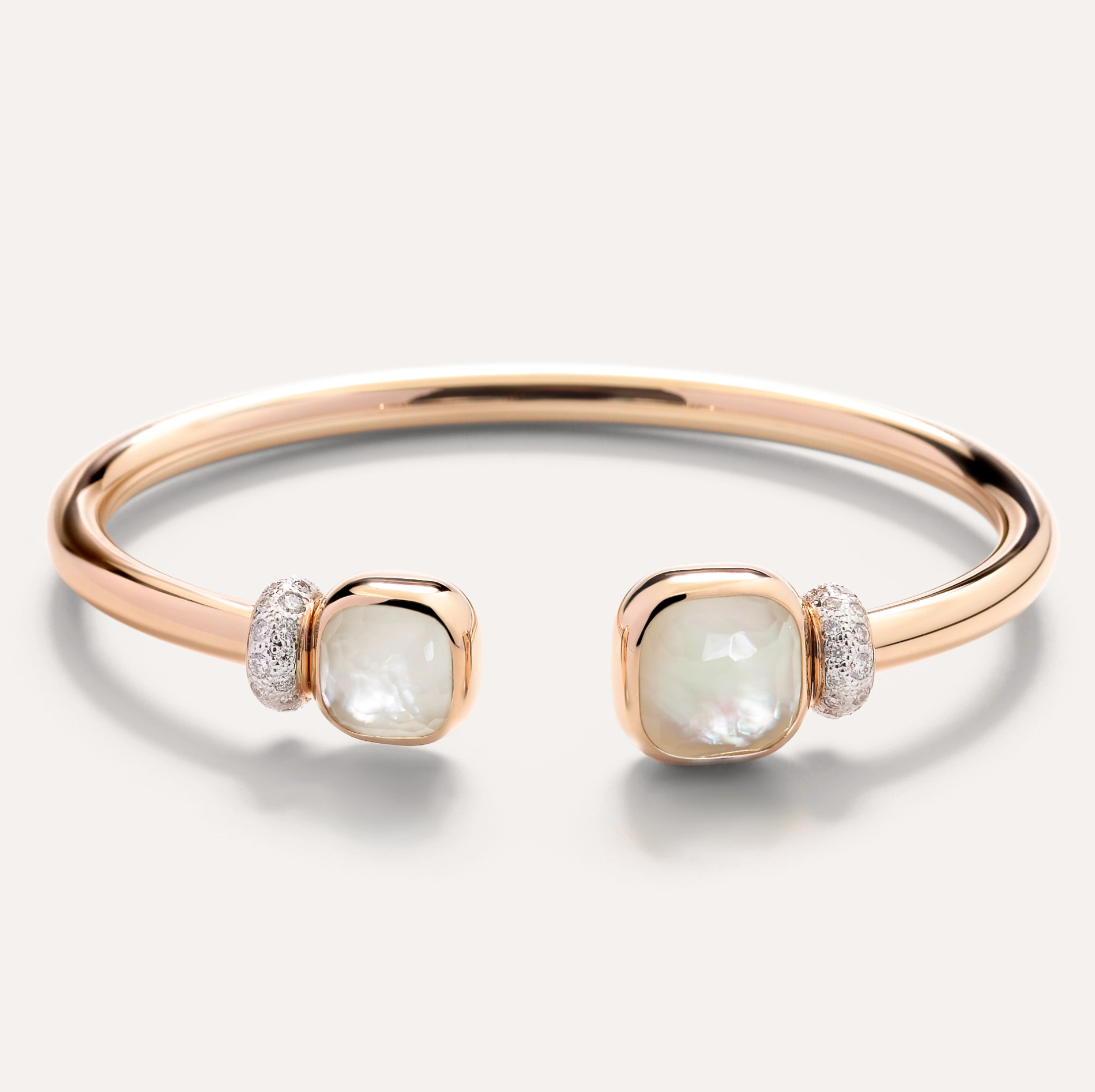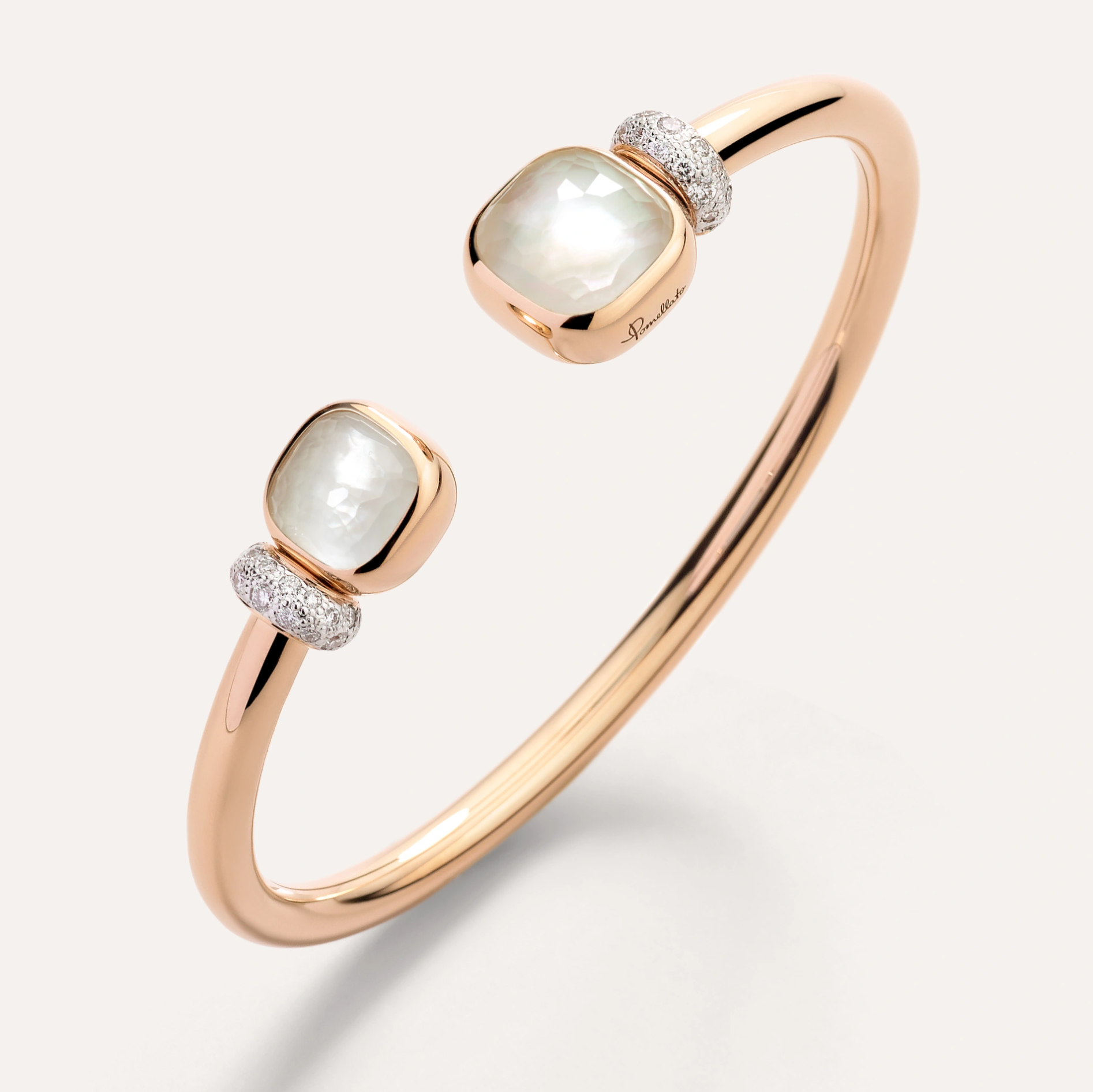A Pomellato white topaz and mother of pearl doublet Nudo bangle bracelet with diamonds, set in 18K rose gold.