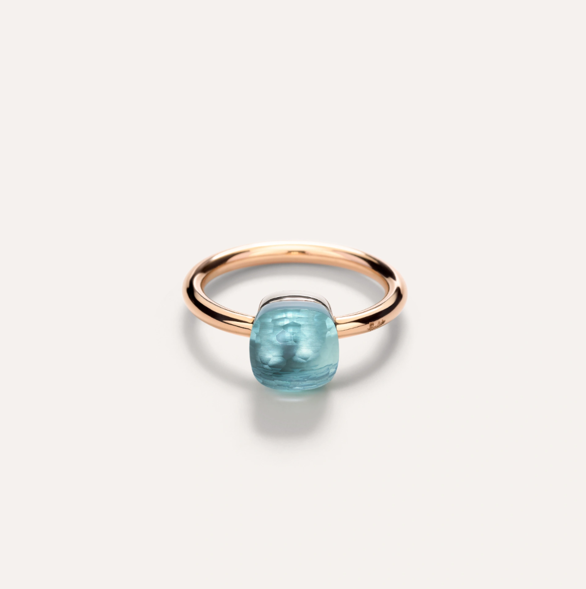 A Pomellato Nudo Petit sky blue topaz ring, set in 18K white and rose gold.