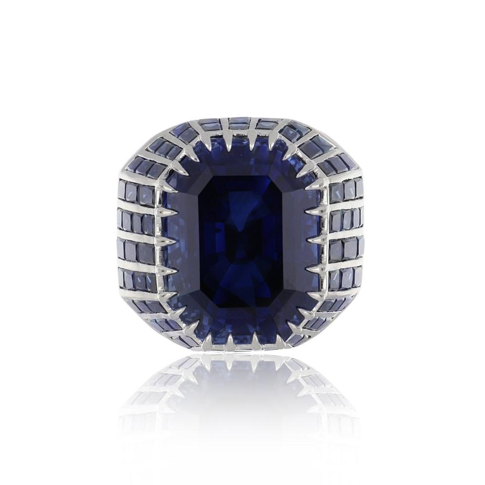 A masterpiece bespoke Seaman Schepps Special Torino sapphire ring accented by calibre-cut sapphires in 18 karat white gold.