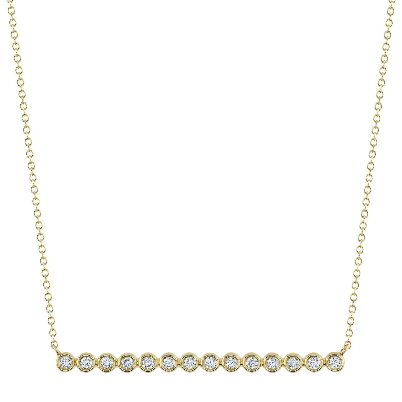 A Shy Creation bezel-set round diamond bar necklace, set in 14K yellow gold.