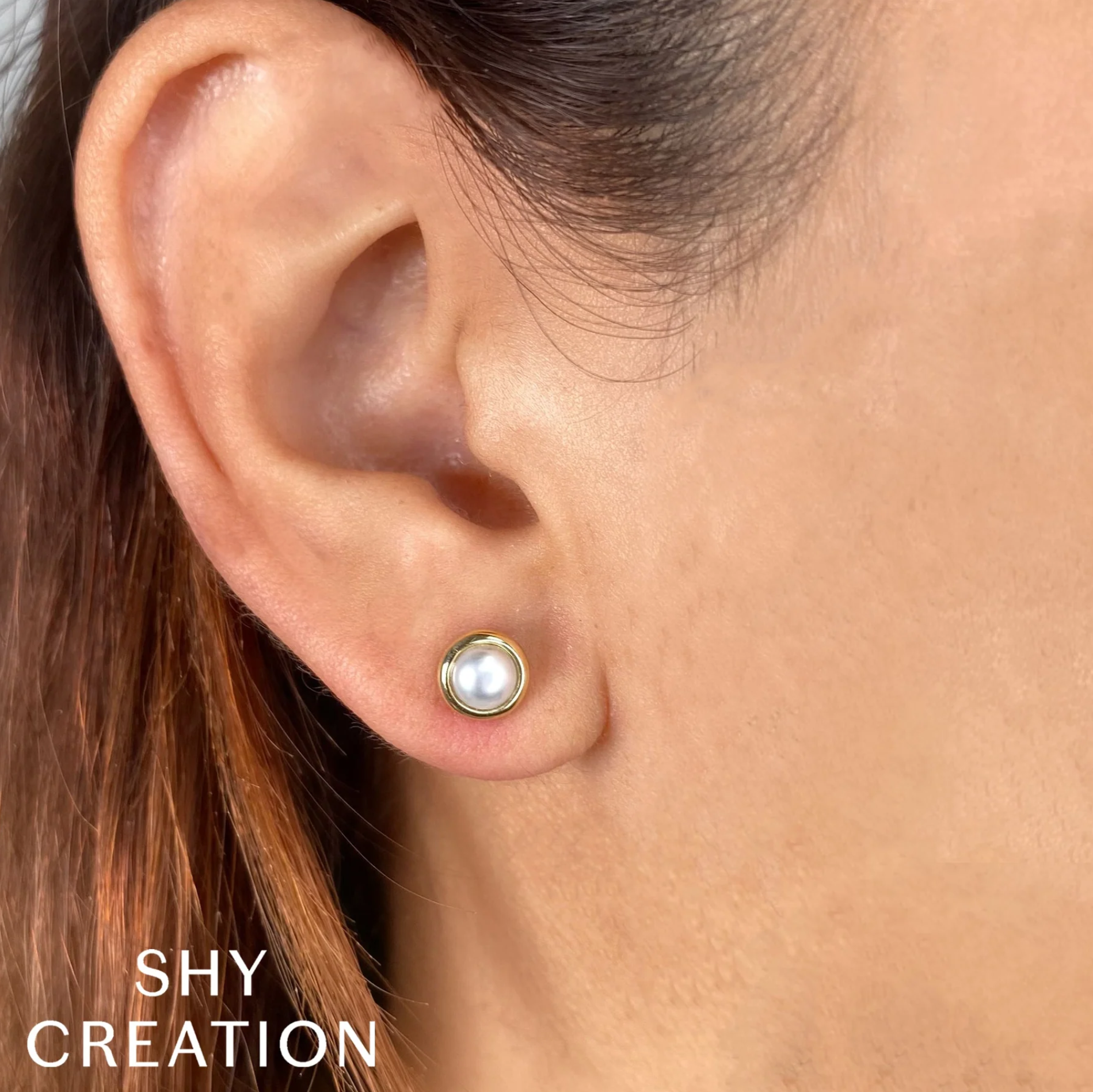 A pair of Shy Creation bezel-set cultured pearl stud earrings, set in 14K yellow gold.