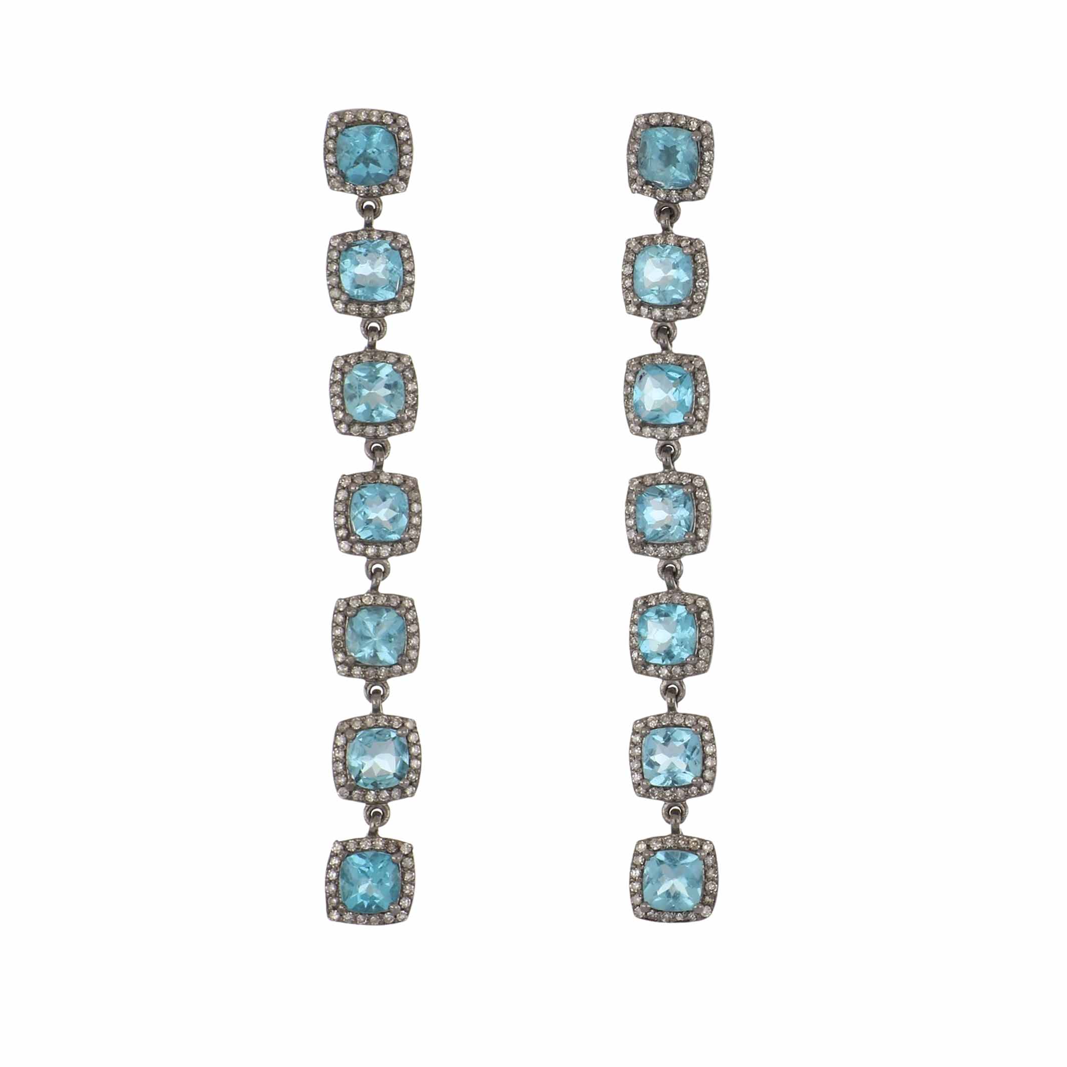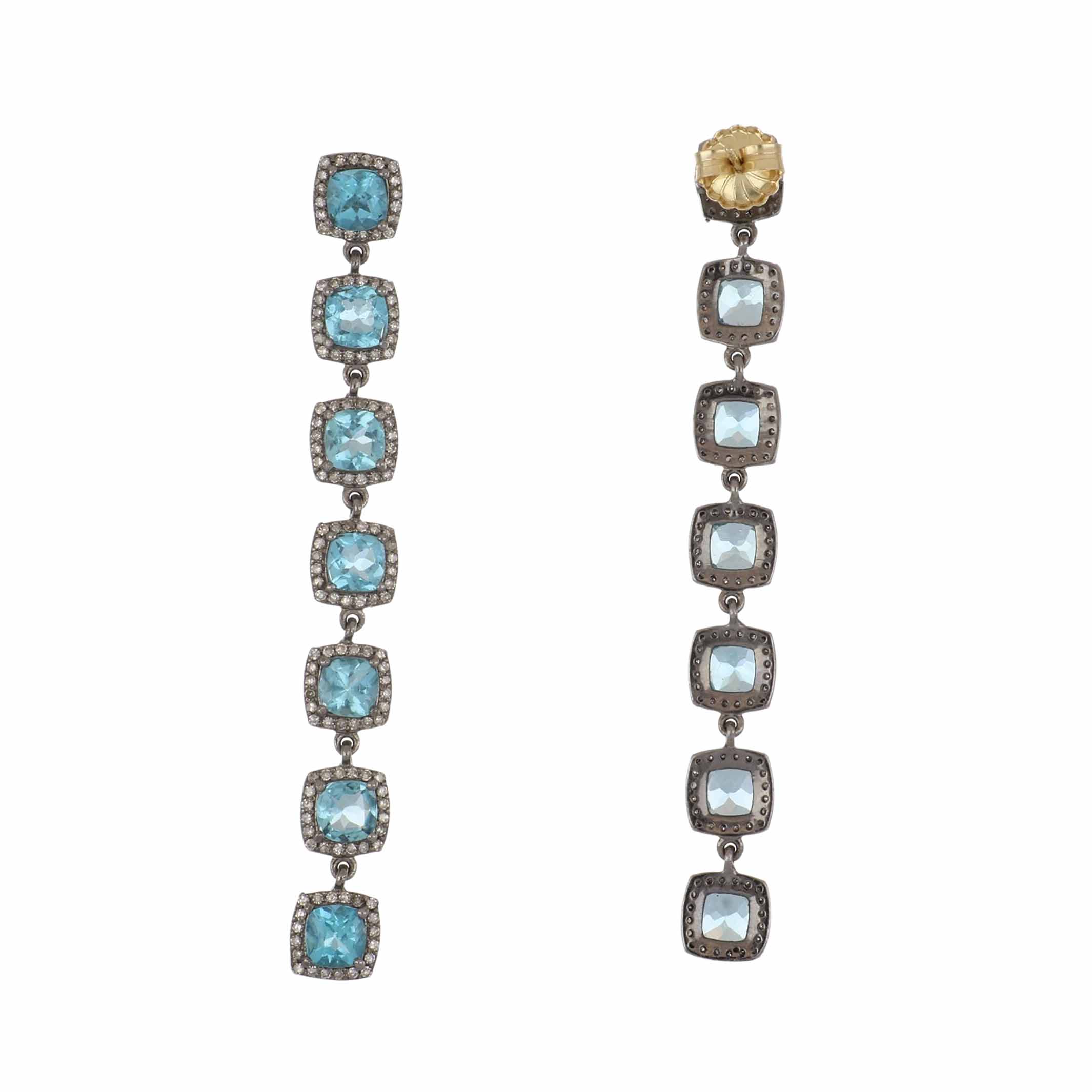 A pair of cushion cut apatite drop earrings set with round diamonds in sterling silver.