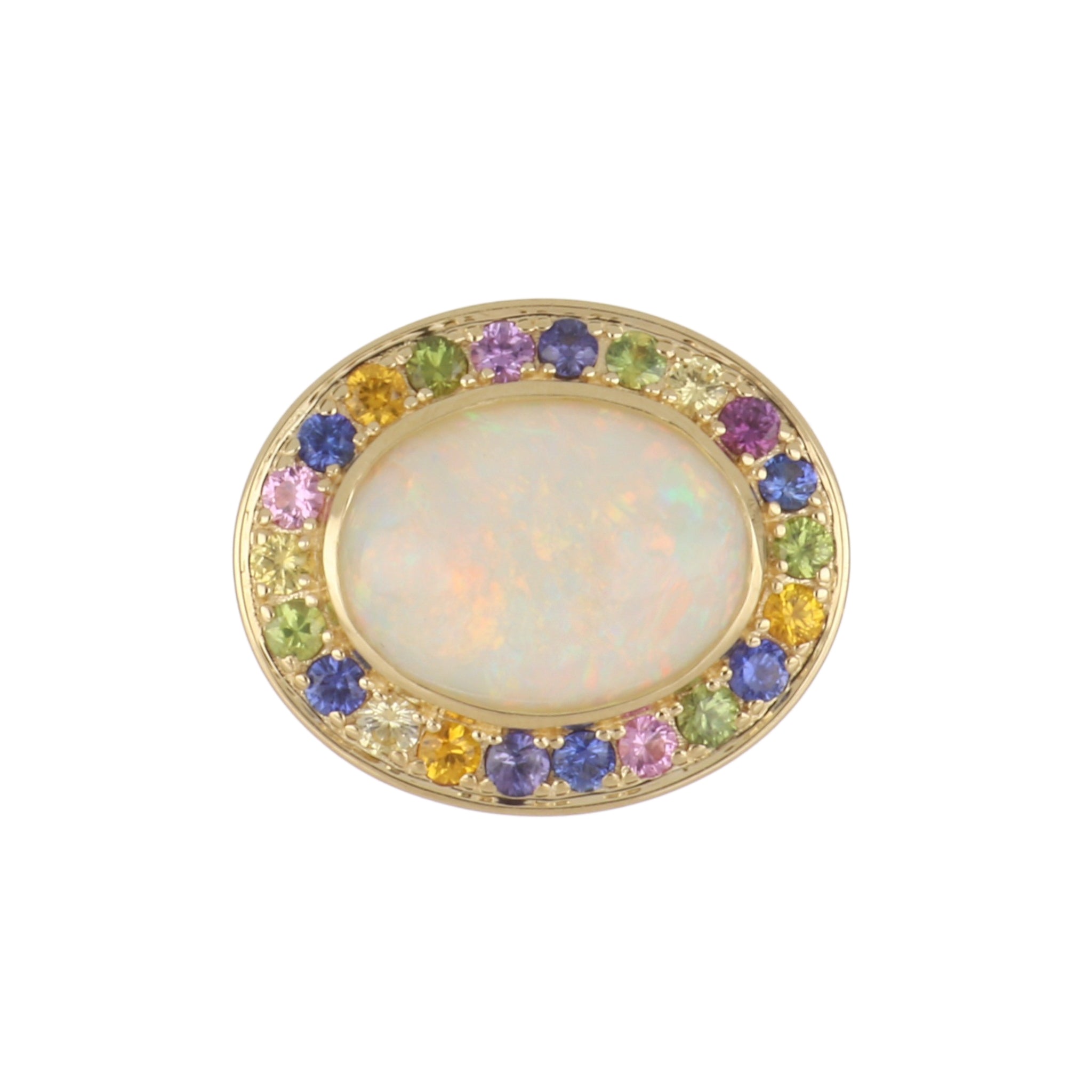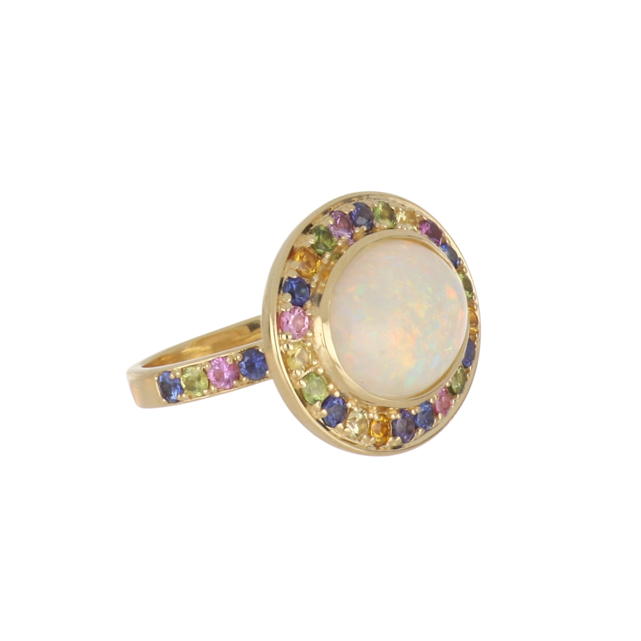 An opal ring with a multi-colored sapphire border in 18 karat yellow gold.