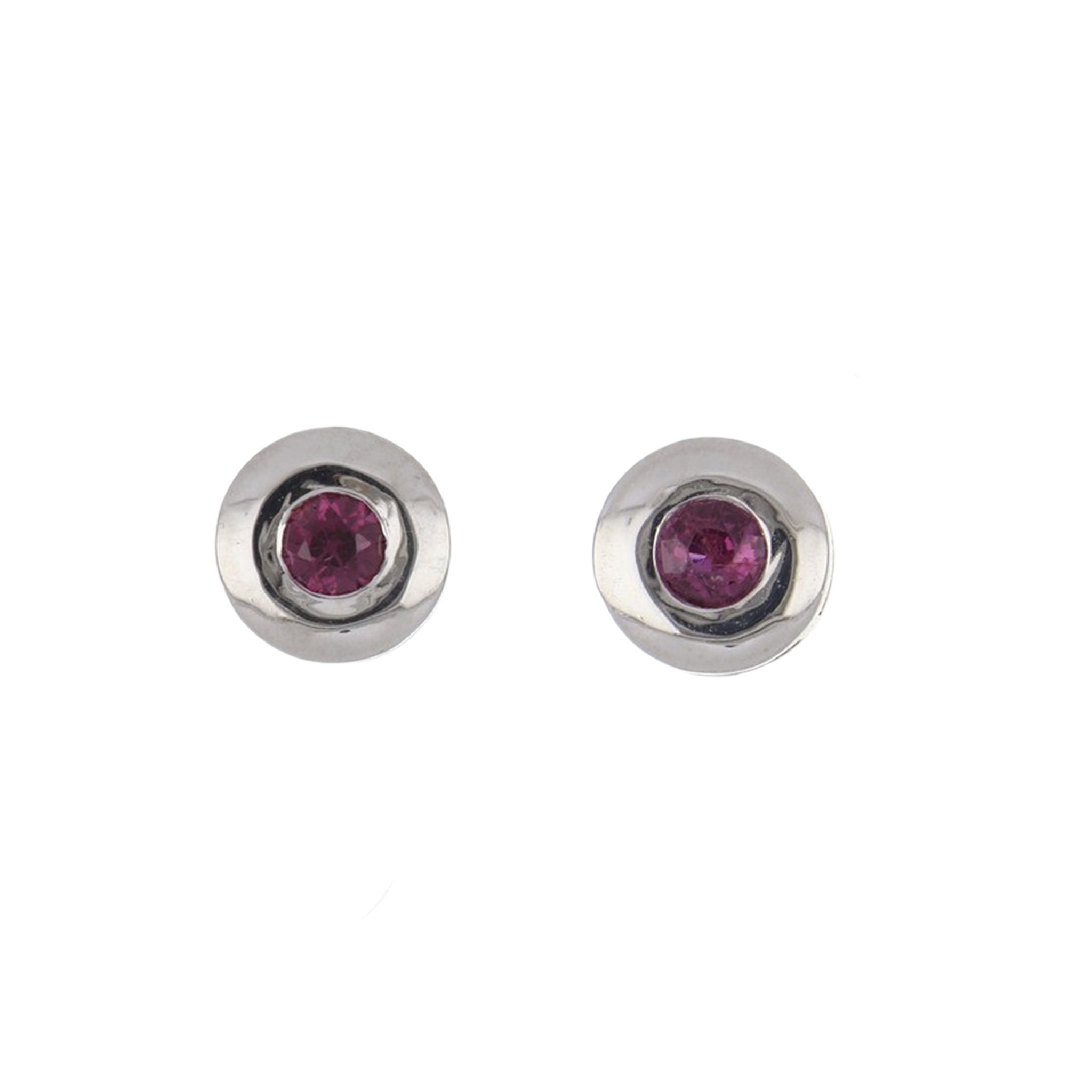 A pair of flush-set round ruby stud earrings set 18k white gold with a thick bezel border.Tenenbaum Collection2 round rubies: 0.40 total carat weight
