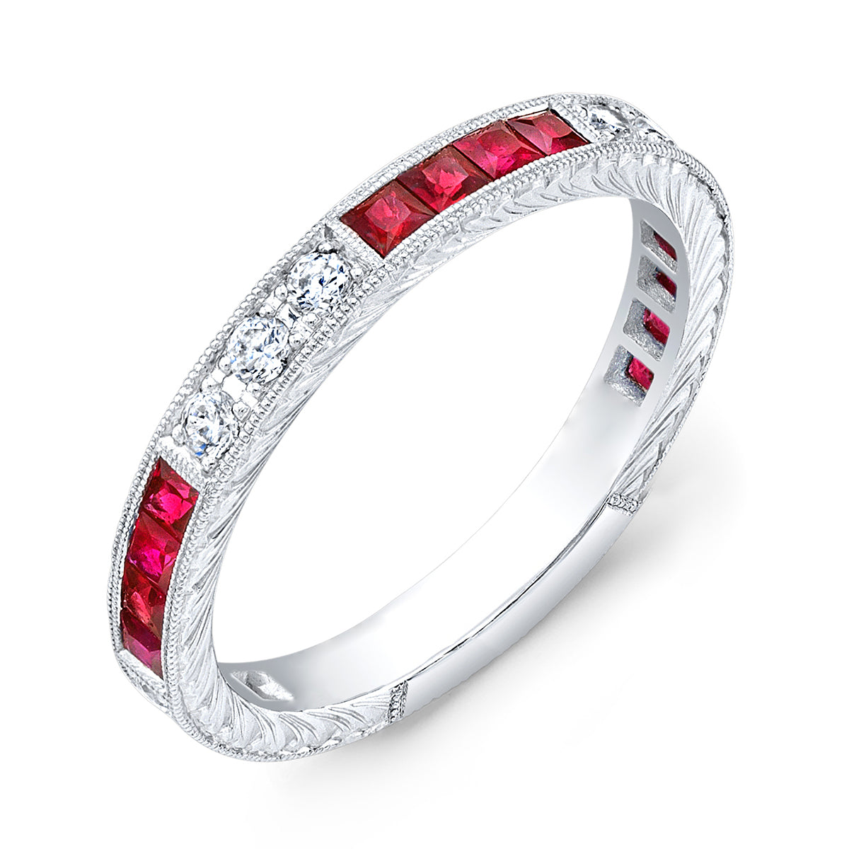 A new diamond and ruby 3/4 band, set in 18k white gold.