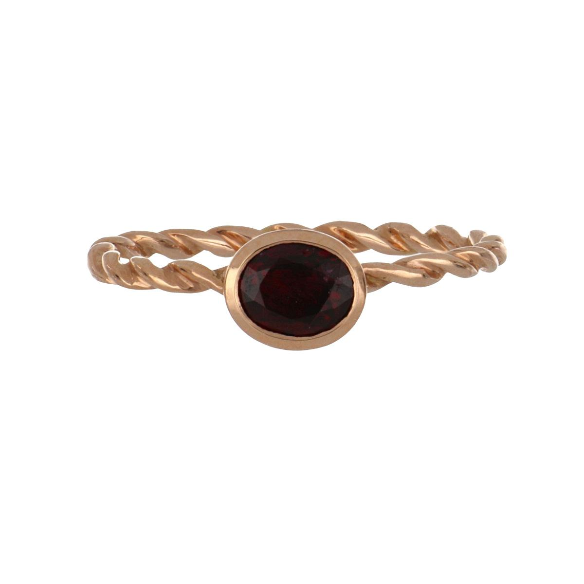A new stackable twist ring featuring a bezel-set ruby in 14k rose gold.