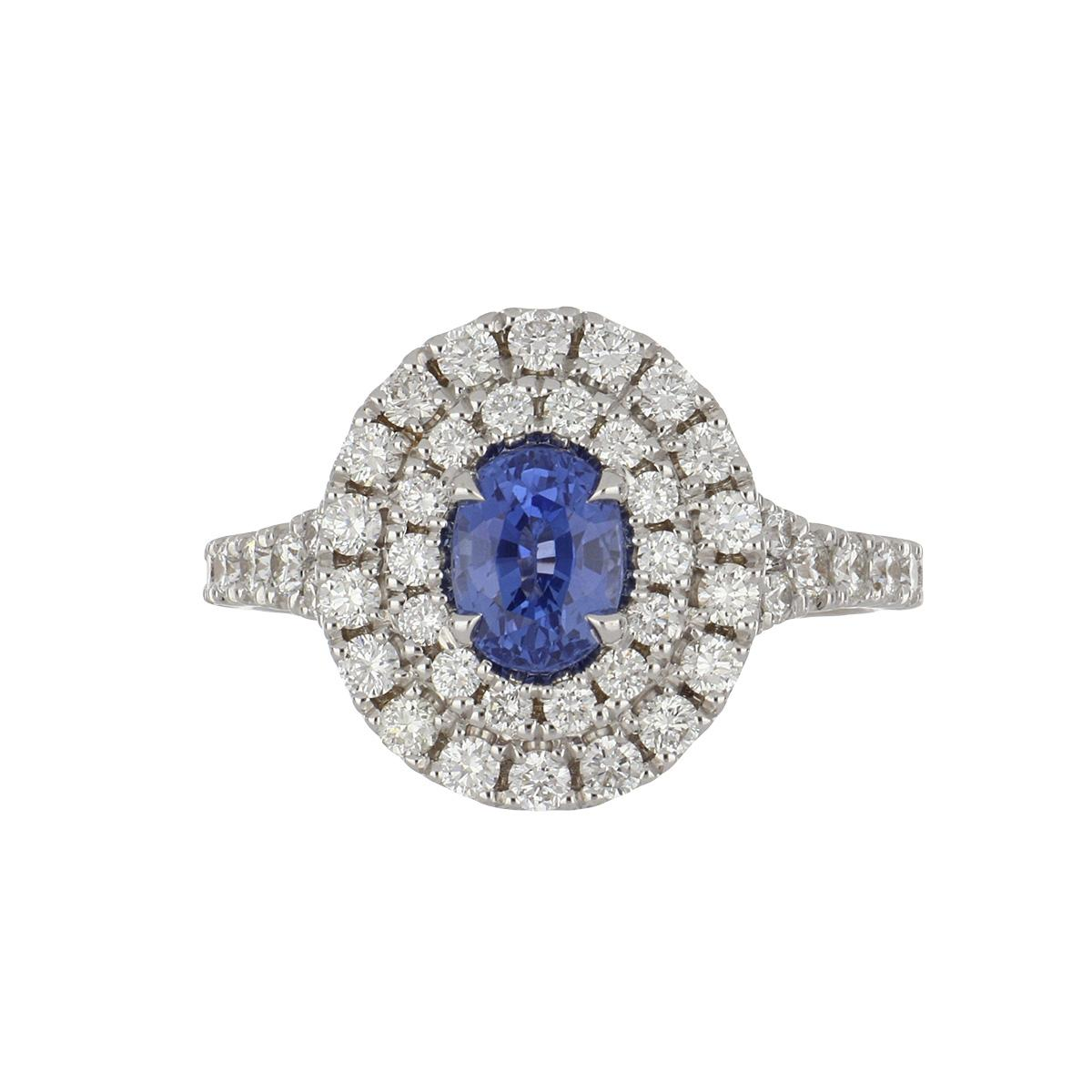A new oval-cut sapphire and double double halo ring set in 18k white gold.