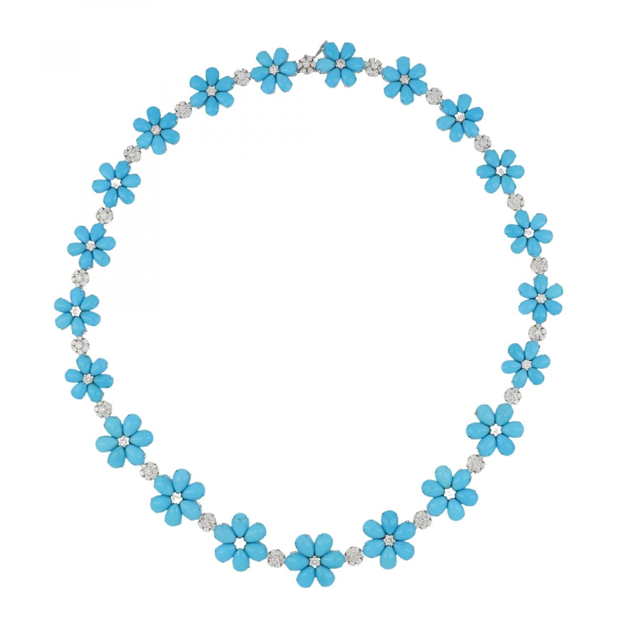 A pear shape cabochon-cut turquoise and diamond floral link necklace set in 18k white gold.