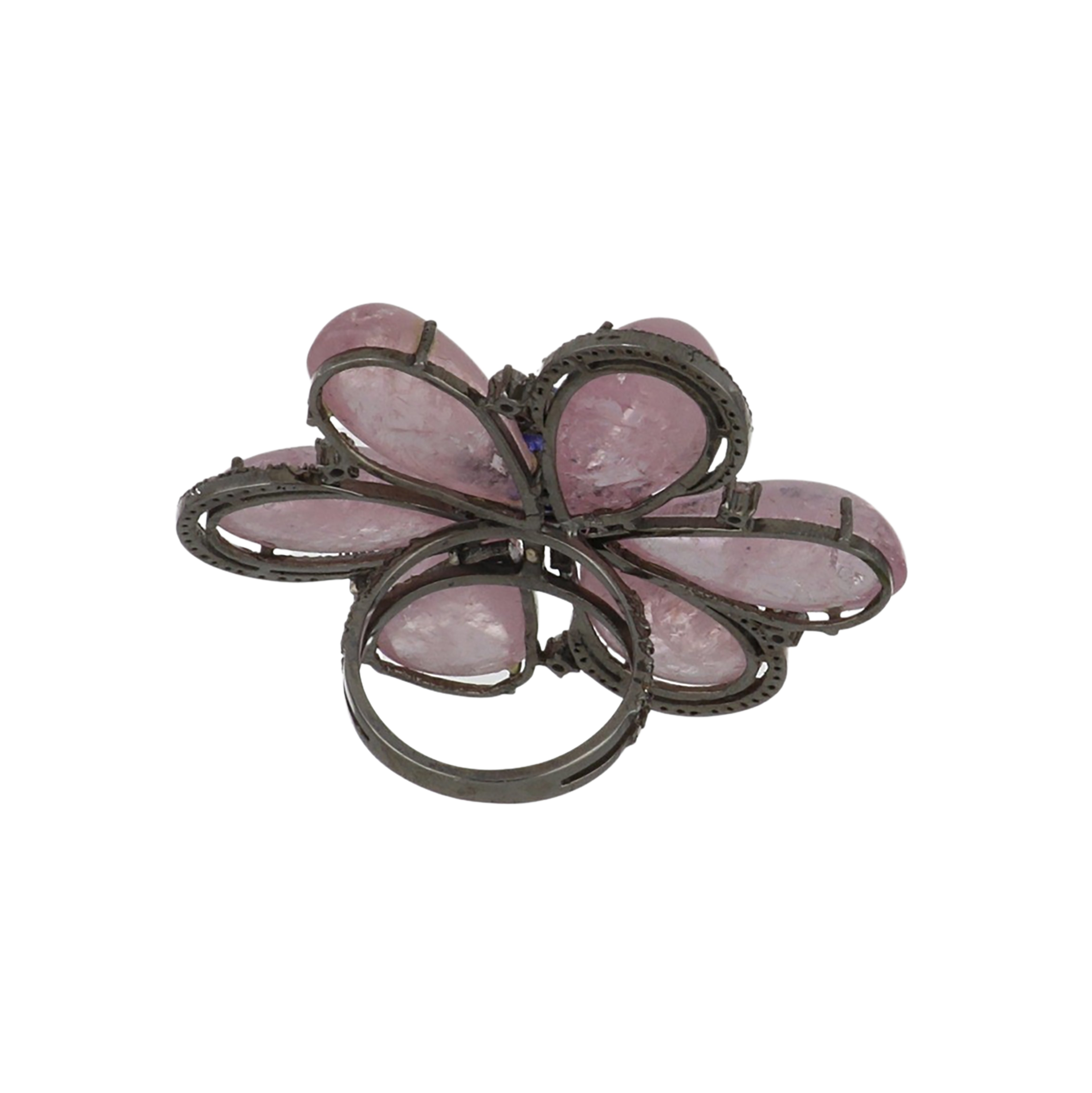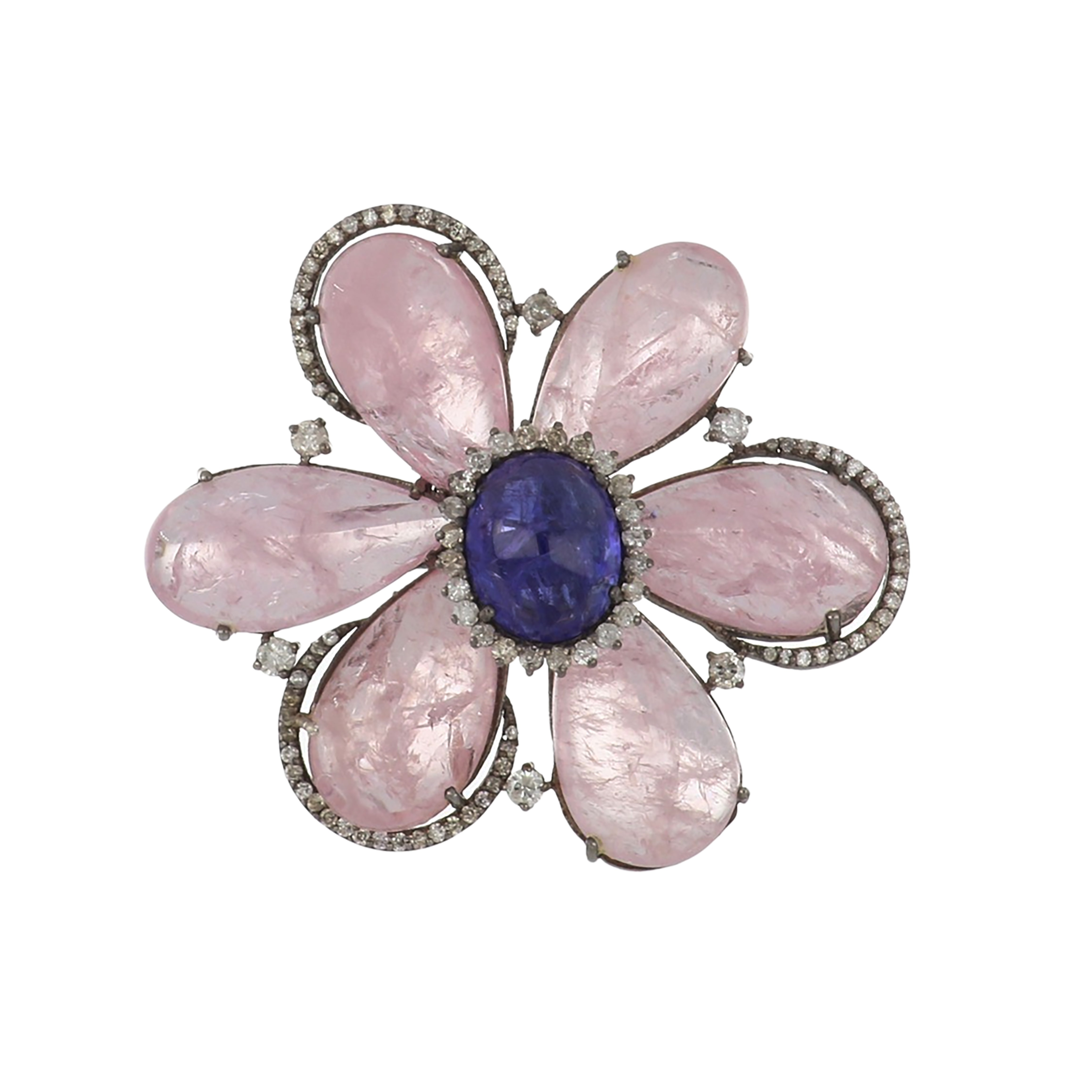 A new cabochon-cut rose quartz, tanzanite and diamond floral ring set in sterling silver.
