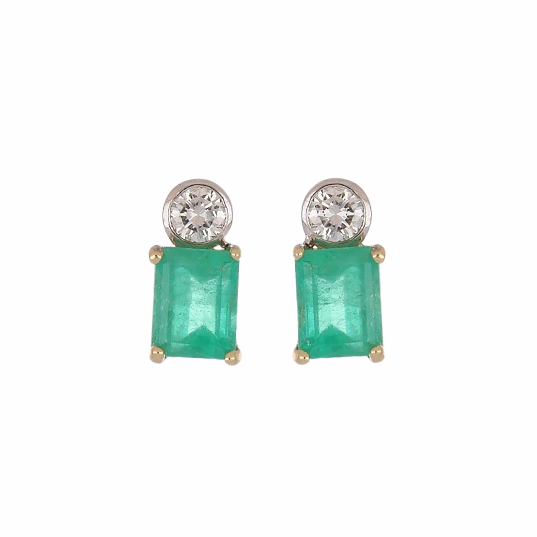 A pair of emerald-cut emerald and round brilliant-cut diamond stud earrings, set in 18K yellow and white gold.