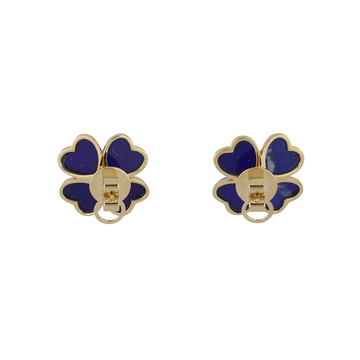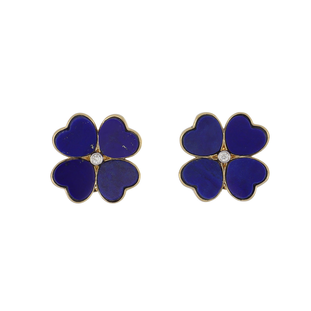A pair of lapis flower stud earrings centered with single round brilliant-cut diamonds, set in 18K yellow gold.