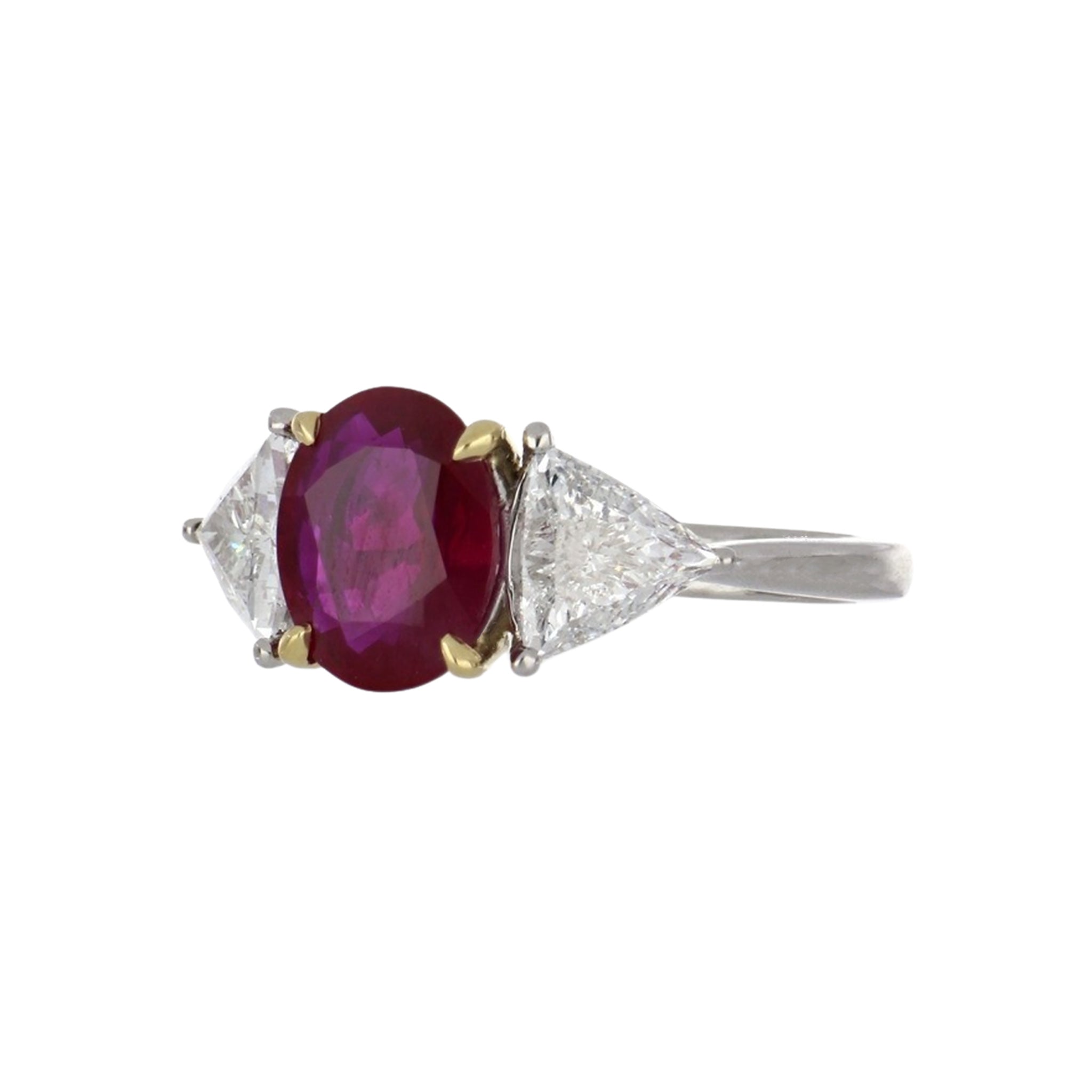 An oval-cut ruby and trillion-cut diamond three stone ring, set in platinum with yellow gold prongs.