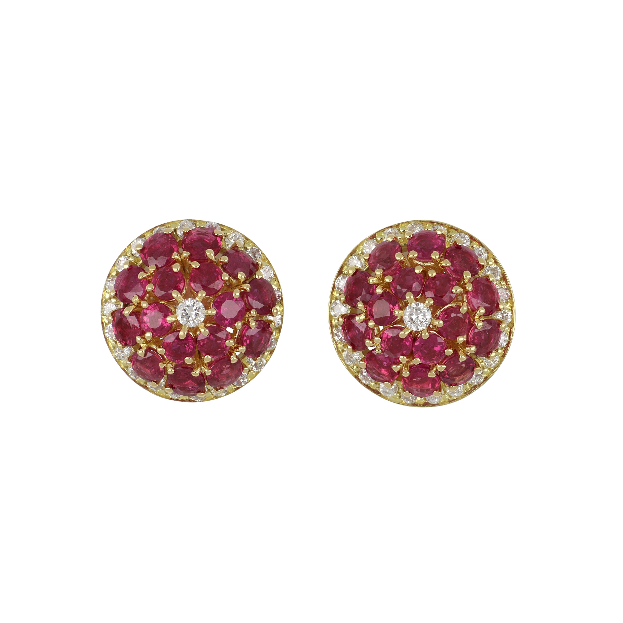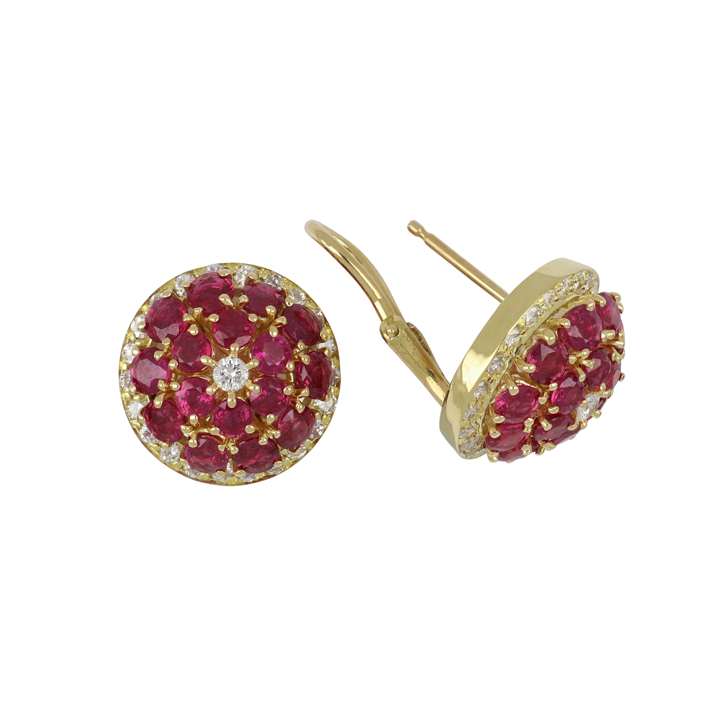 A pair of round ruby and round brilliant cut diamond cluster earrings, set in 18K yellow gold.