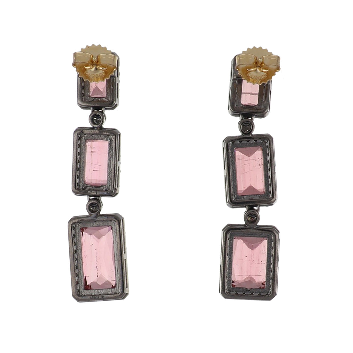 A rectangular shape pink tourmaline and diamond necklace and earring suite, set in sterling silver.