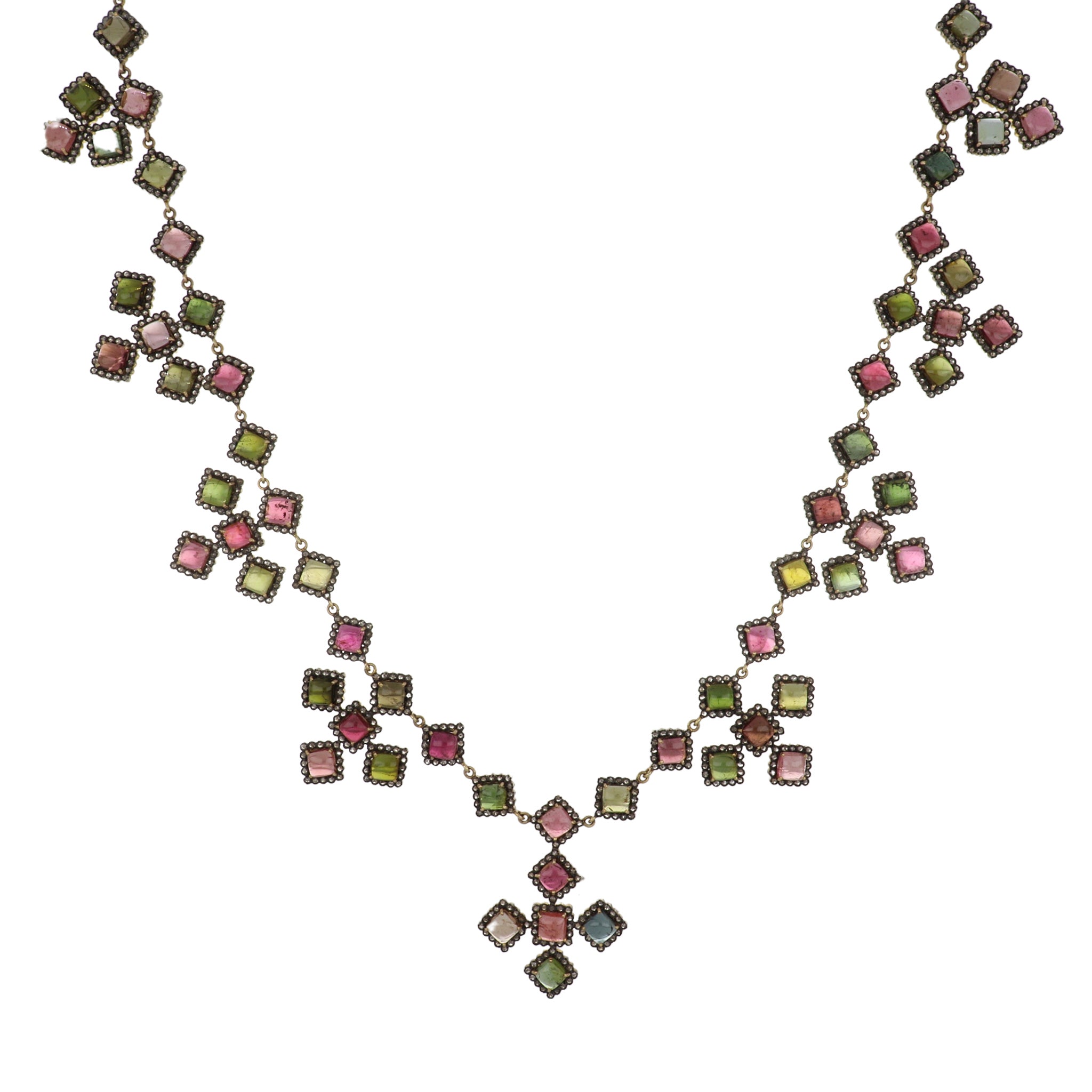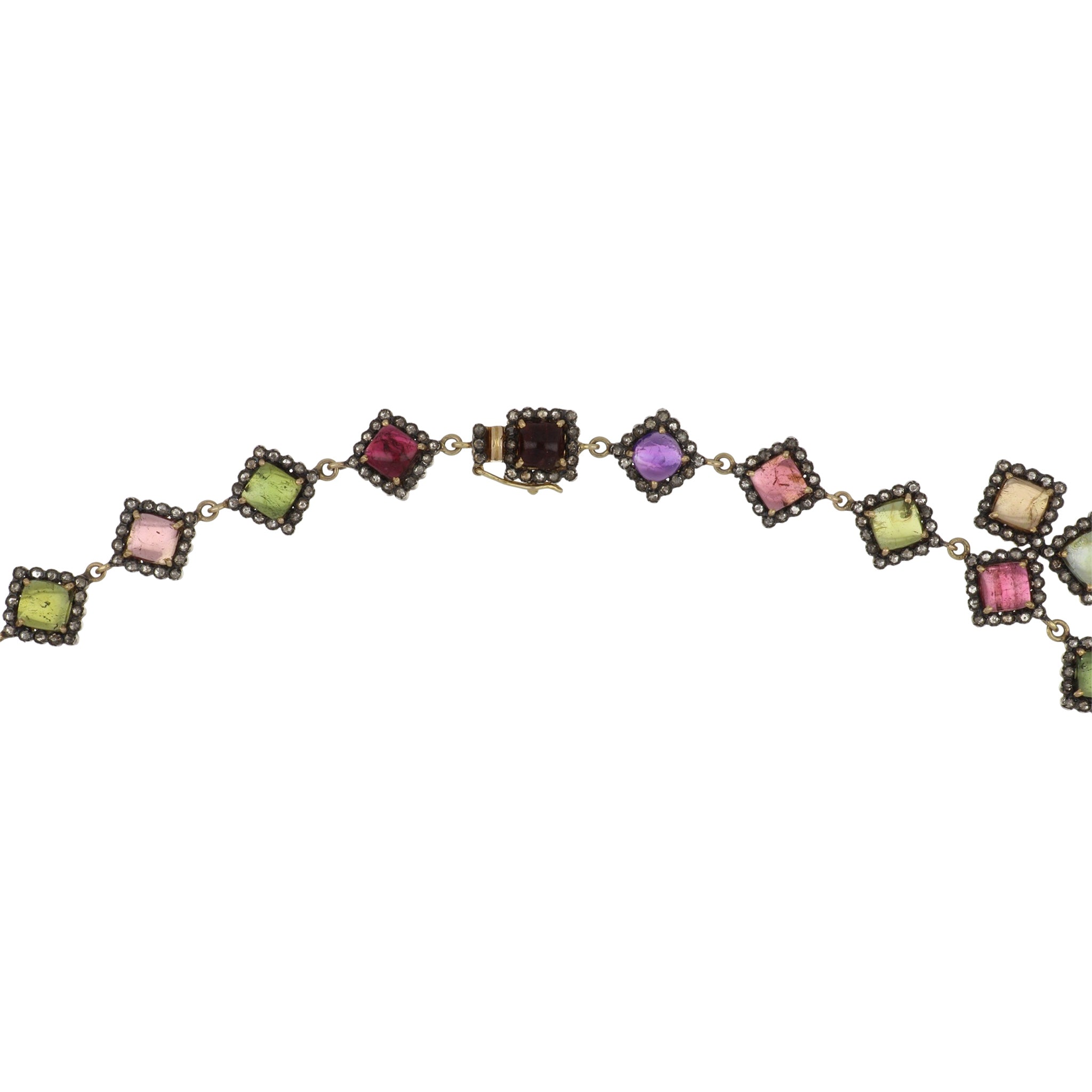 A multicolored cabochon tourmaline necklace and earring suite with diamond accents, set in sterling silver and 18K yellow gold.