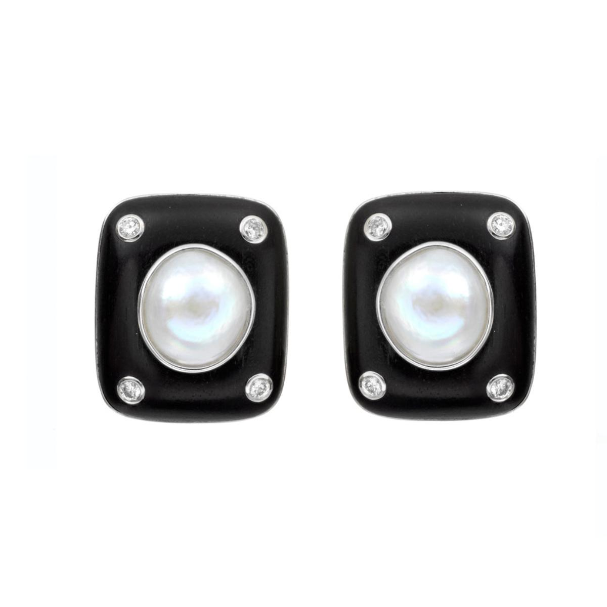 A pair of Trianon 18K white gold cushion ebony wood earrings with baroque freshwater pearl centers and diamond accents.