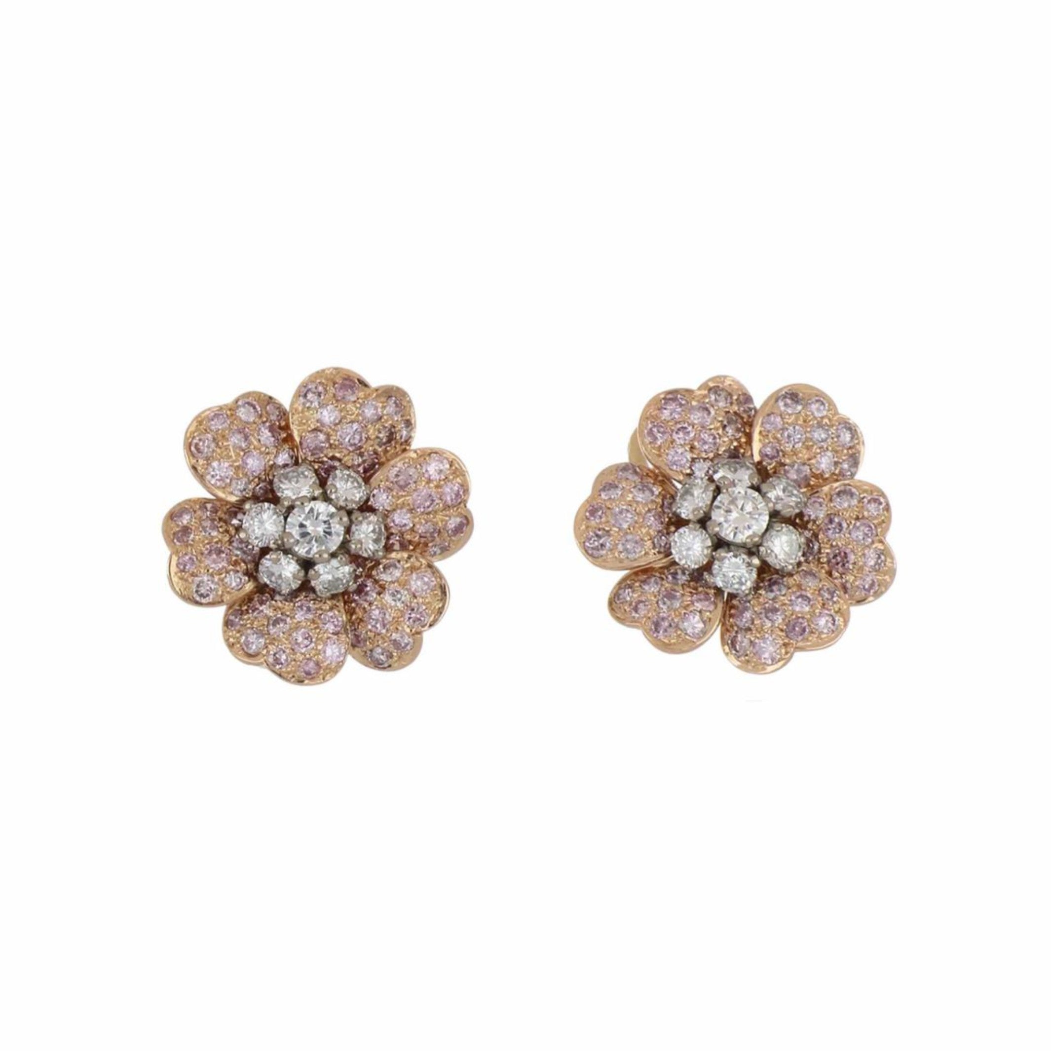 A pair of vintage pink and white round brilliant cut diamond flower earrings, set in 18K yellow, rose and white gold. Time Period: Between 1975-1998