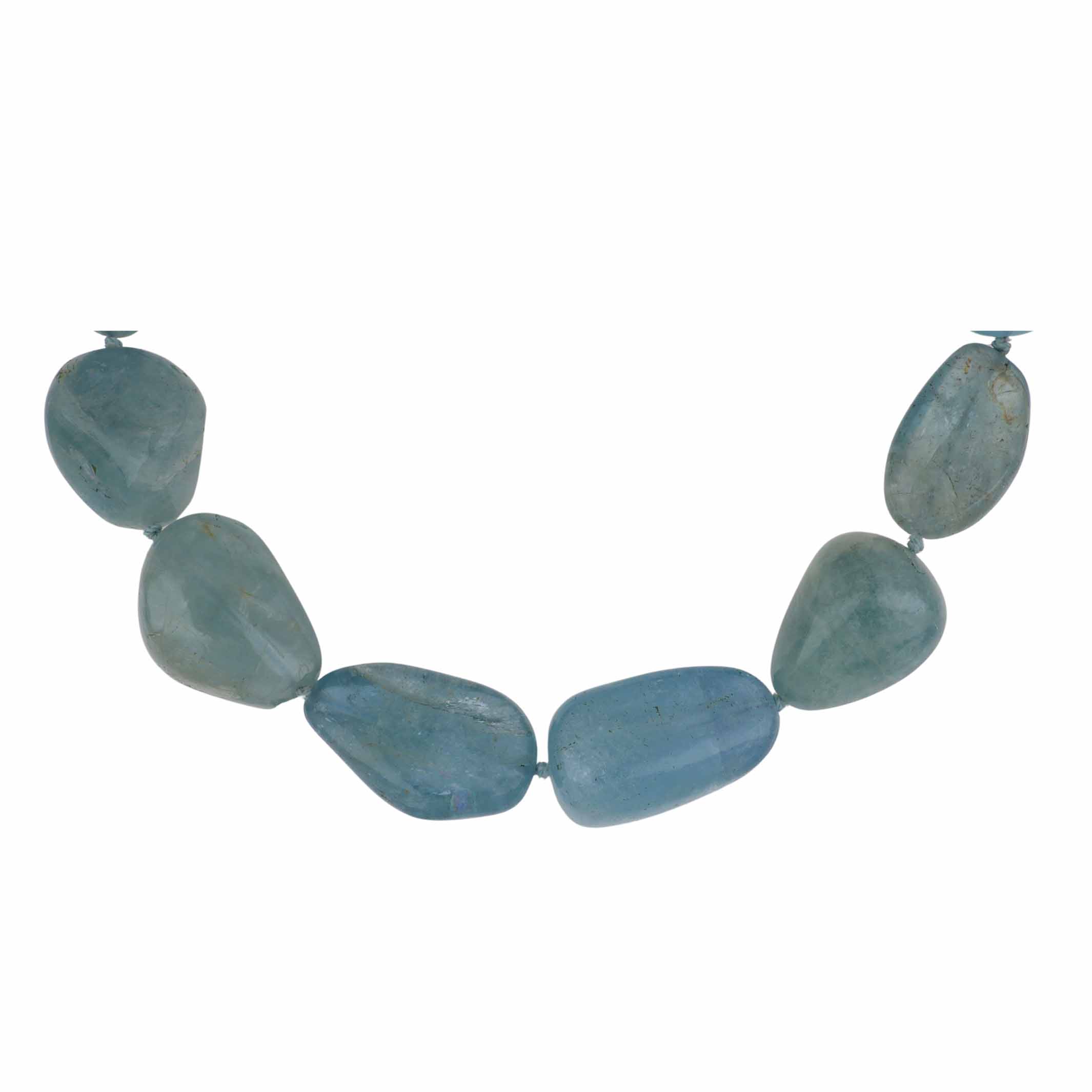 A vintage oversized polished aquamarine pebble bead necklace with an organic 18K yellow gold clasp. Signed Tambetti, circa 1970.