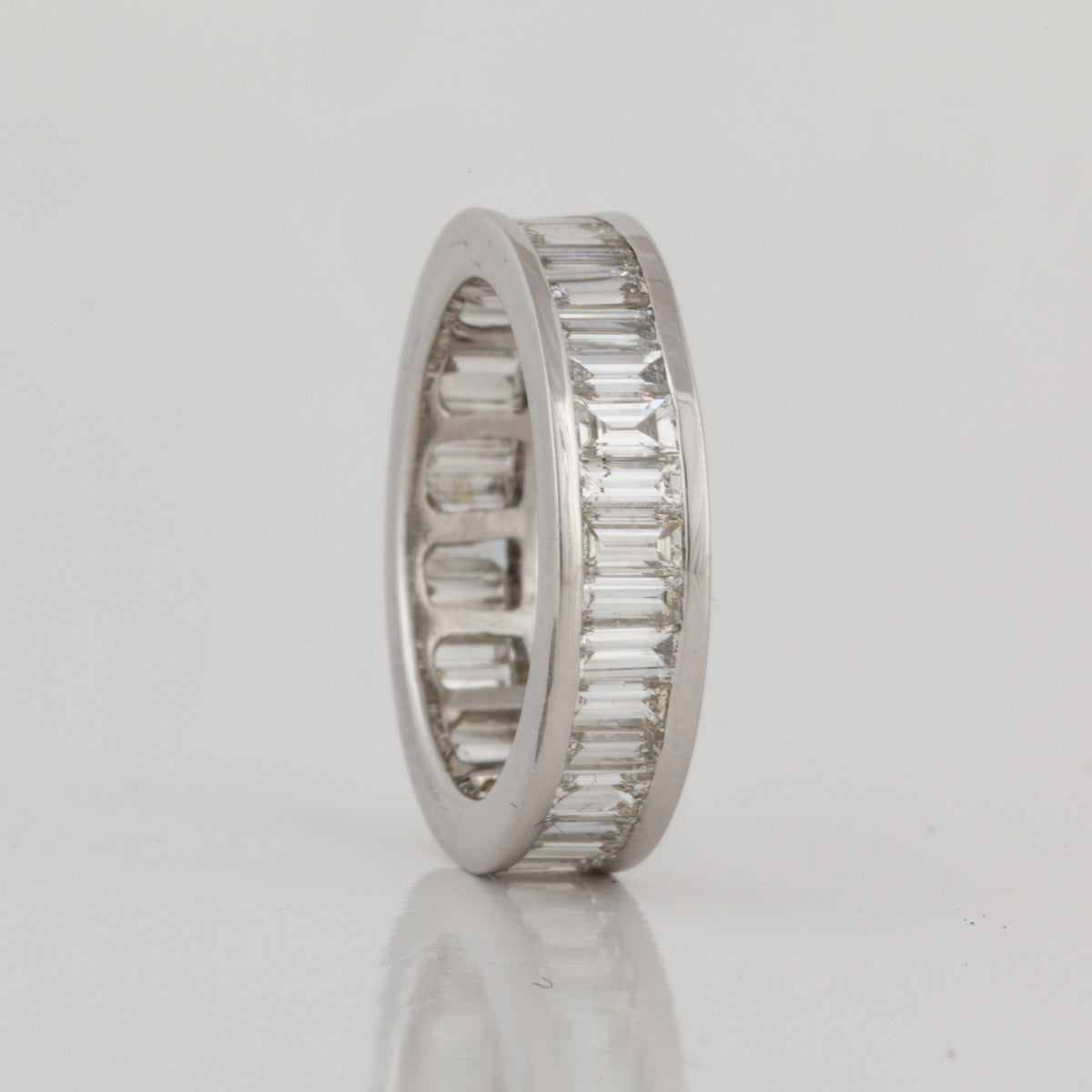 An estate channel-set baguette-cut diamond eternity band, set in platinum.