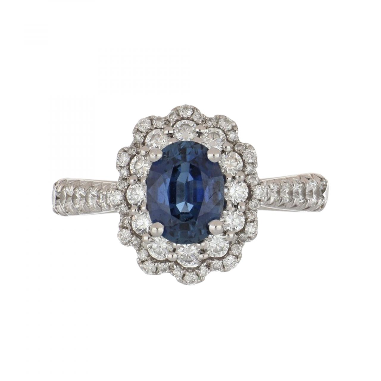 An estate modern, oval shape sapphire and round diamond double halo ring set in 18k white gold. Circa 2020.