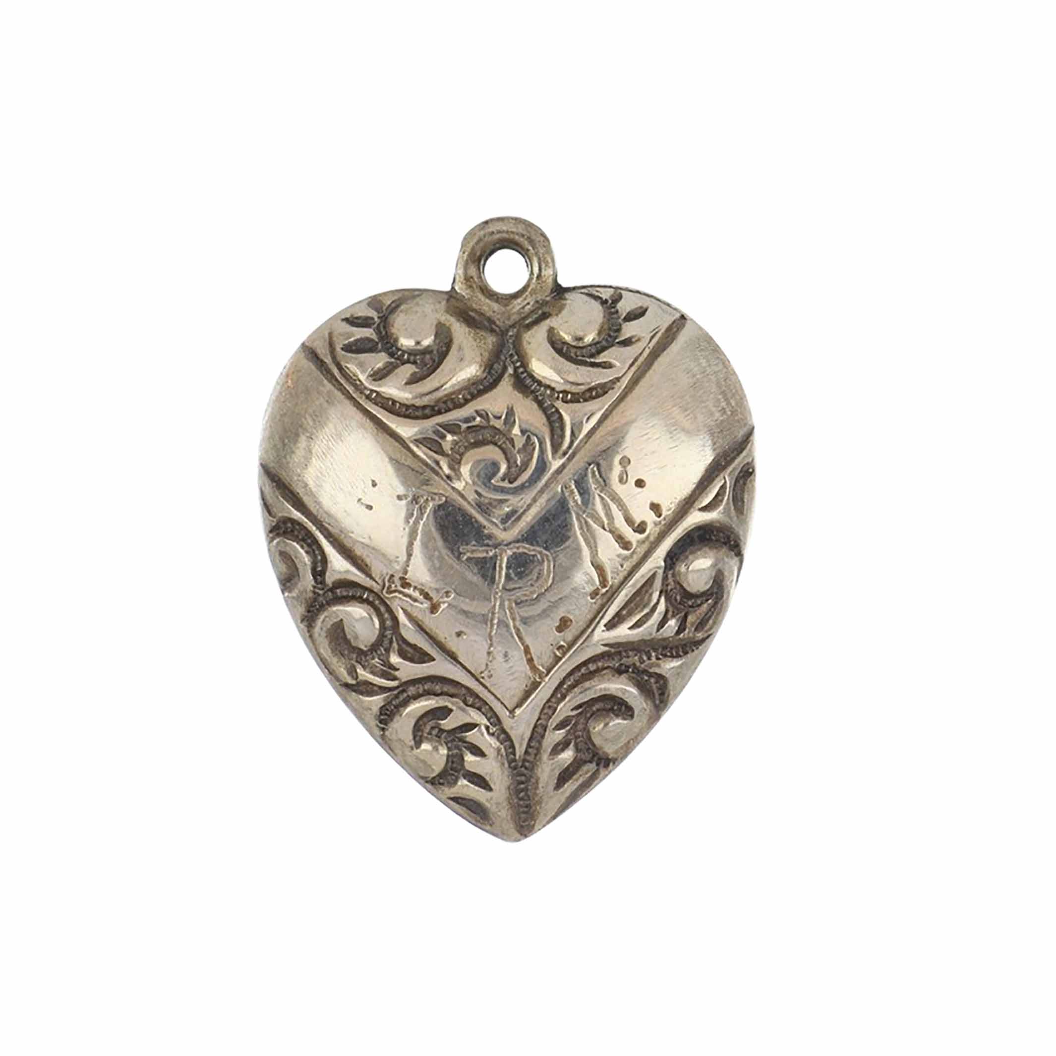A sterling silver filigree heart charm with "L.R.M" engraved on one side.