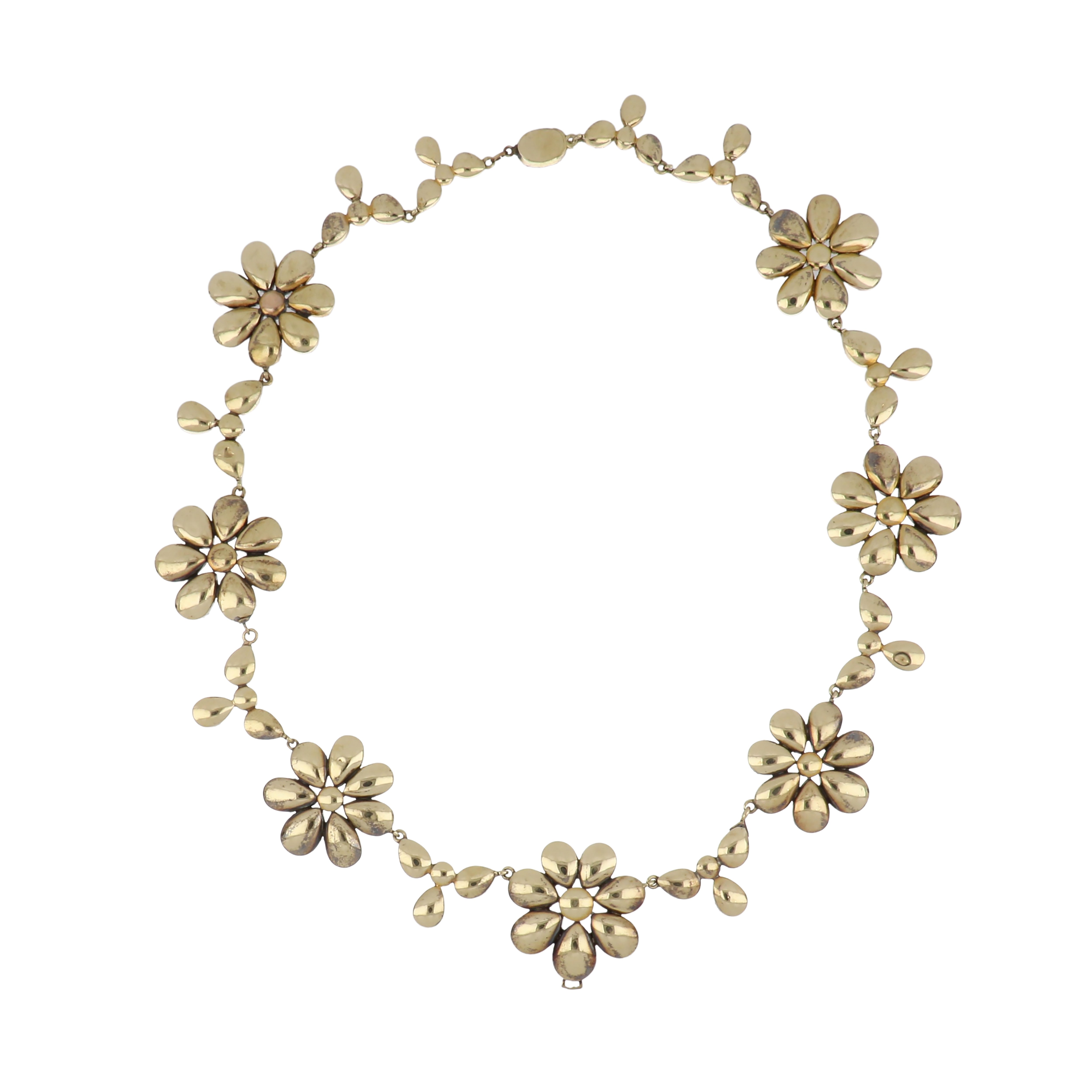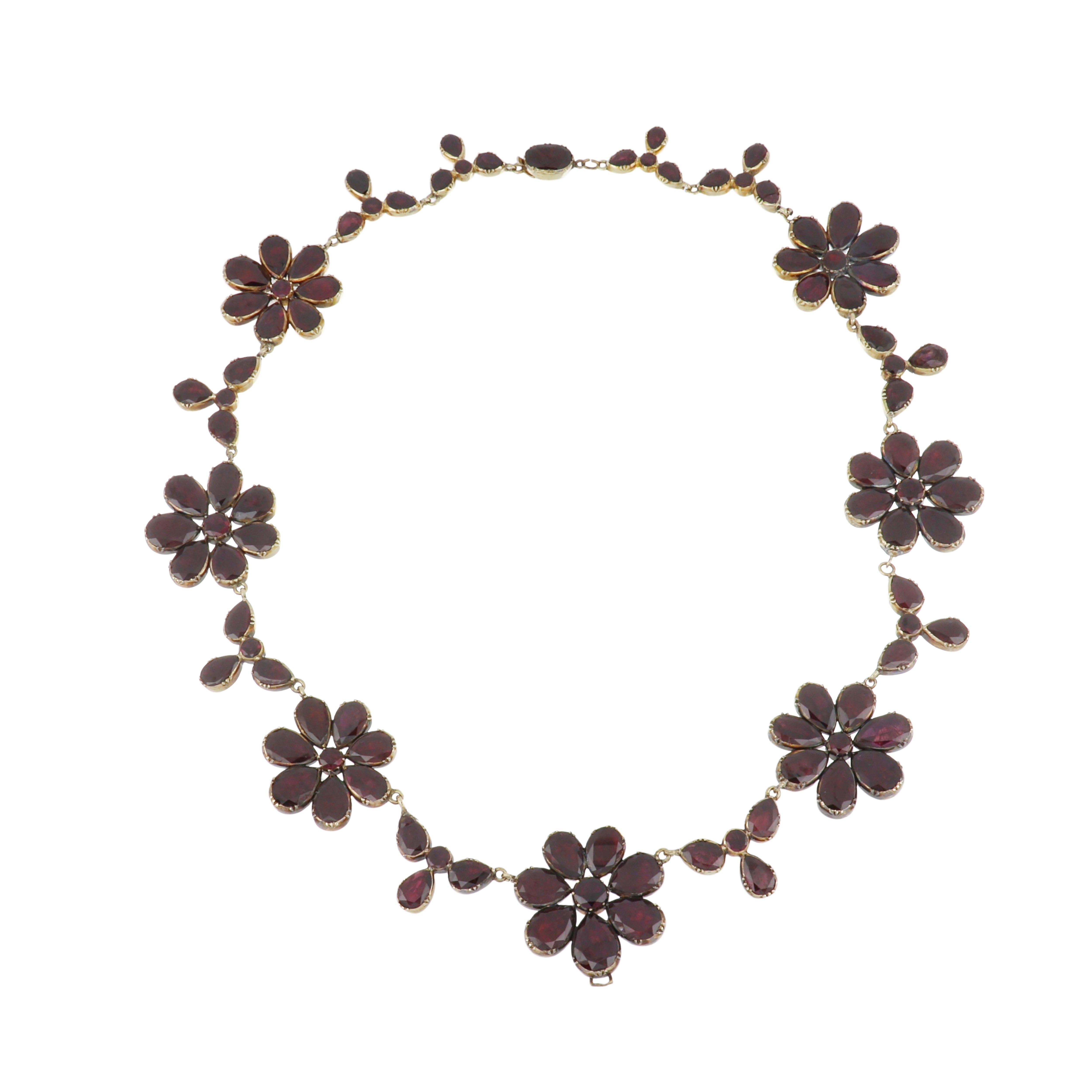A Georgian 15K yellow gold foiled flat-cut Almandine garnet flower collar necklace. Circa 1820.