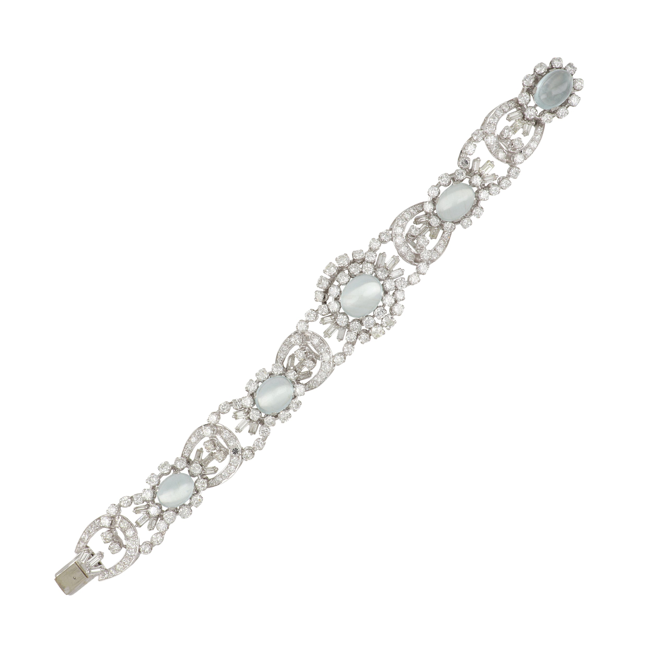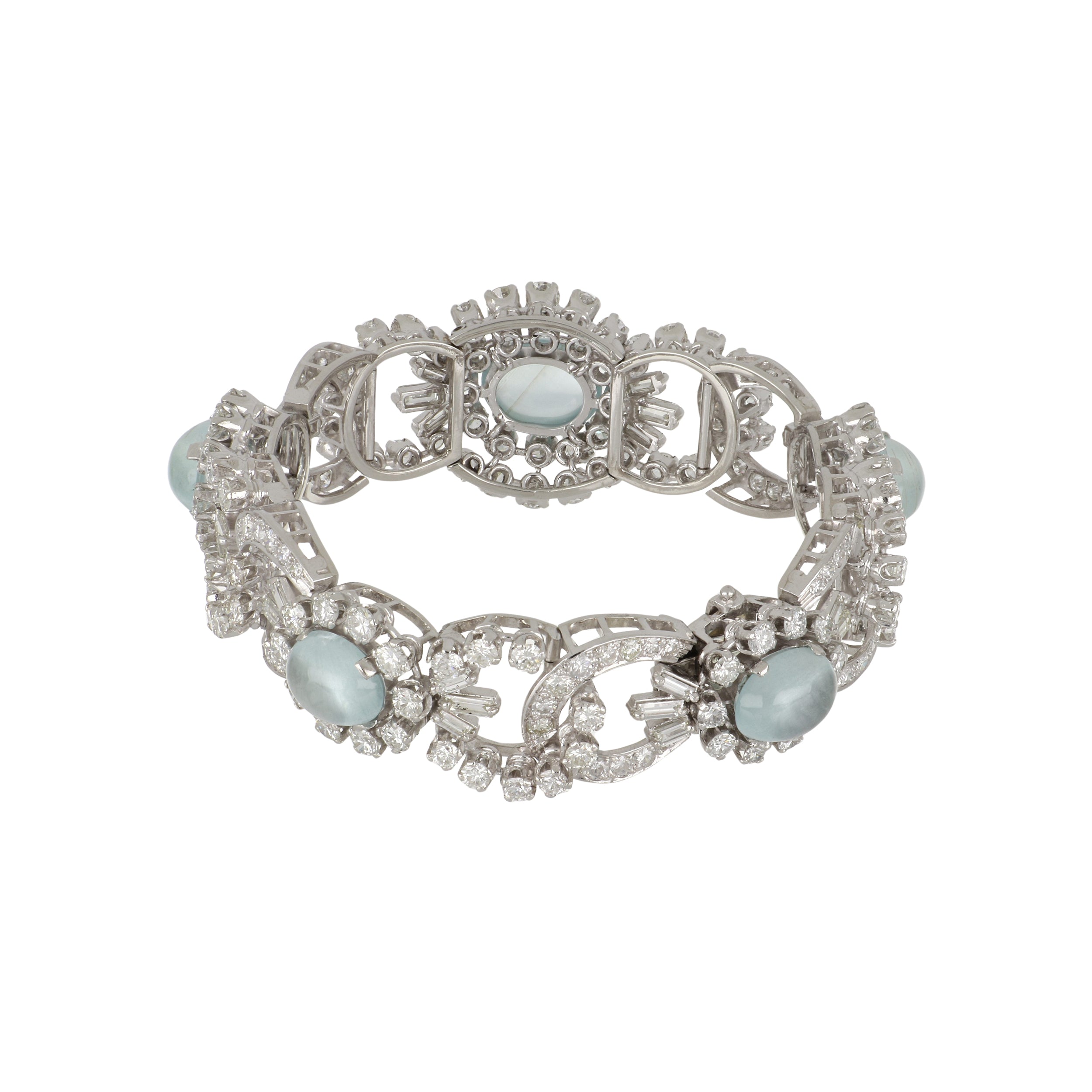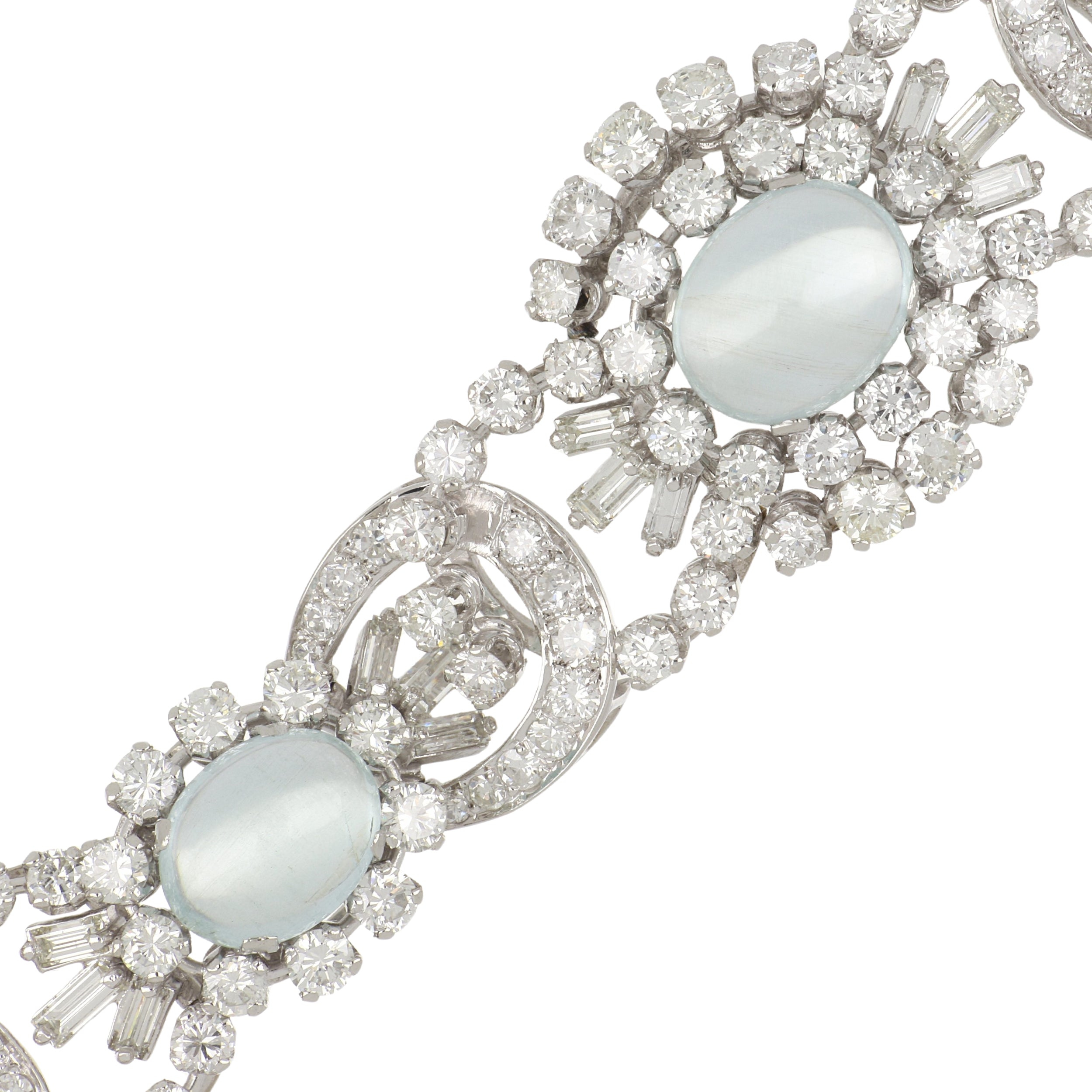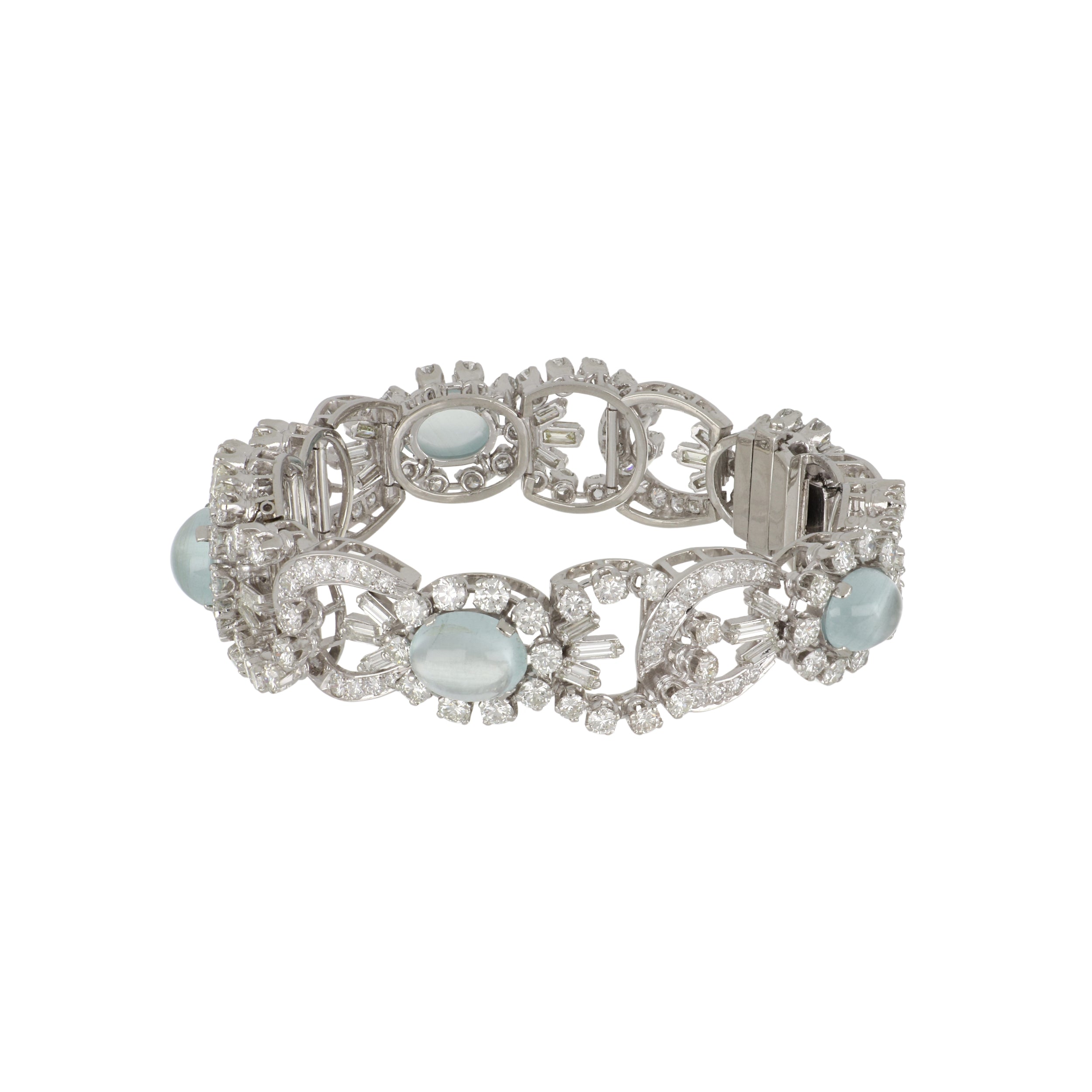 A Mid-Century mixed cut diamond and oval cabochon aquamarine articulated link bracelet, set in platinum. Circa 1960.