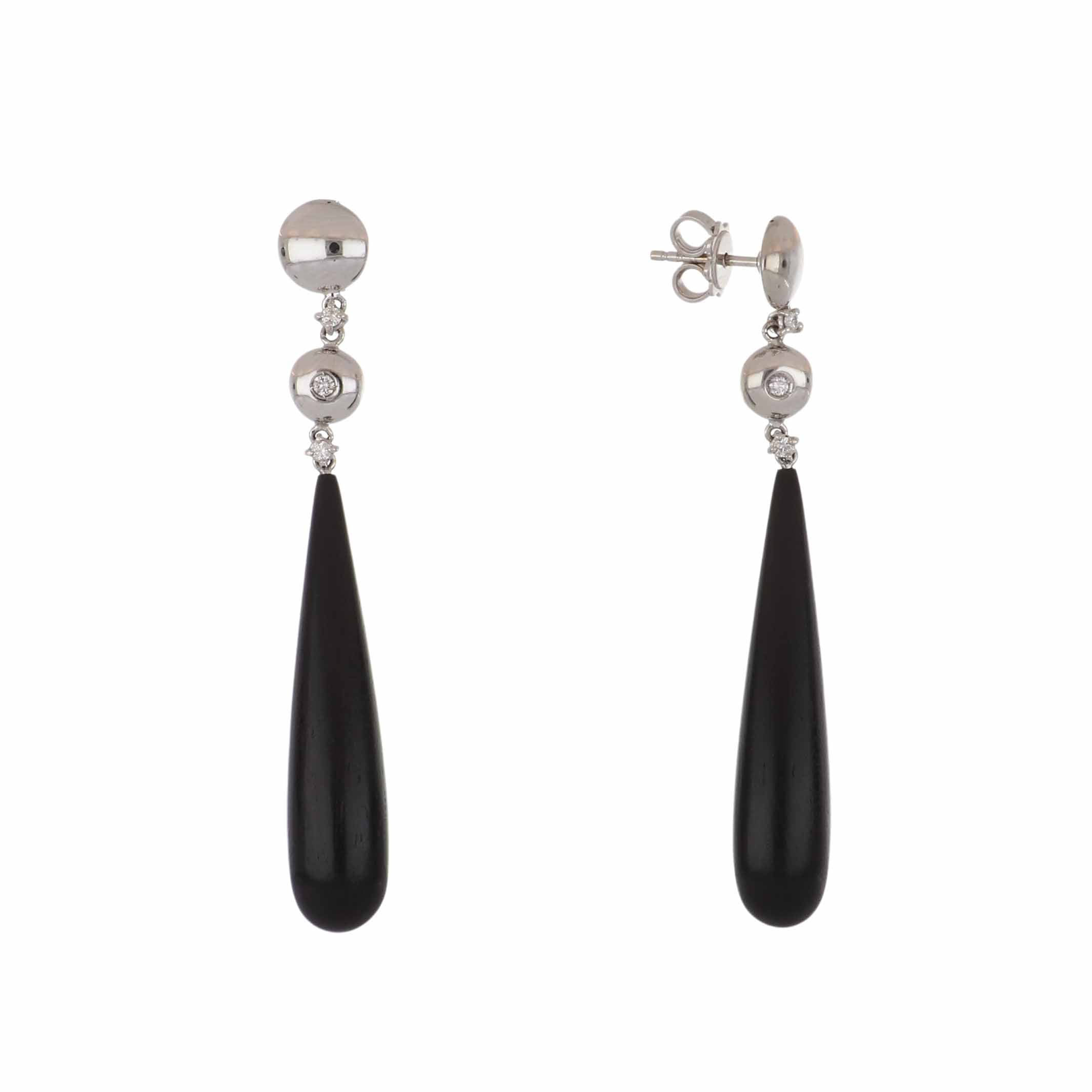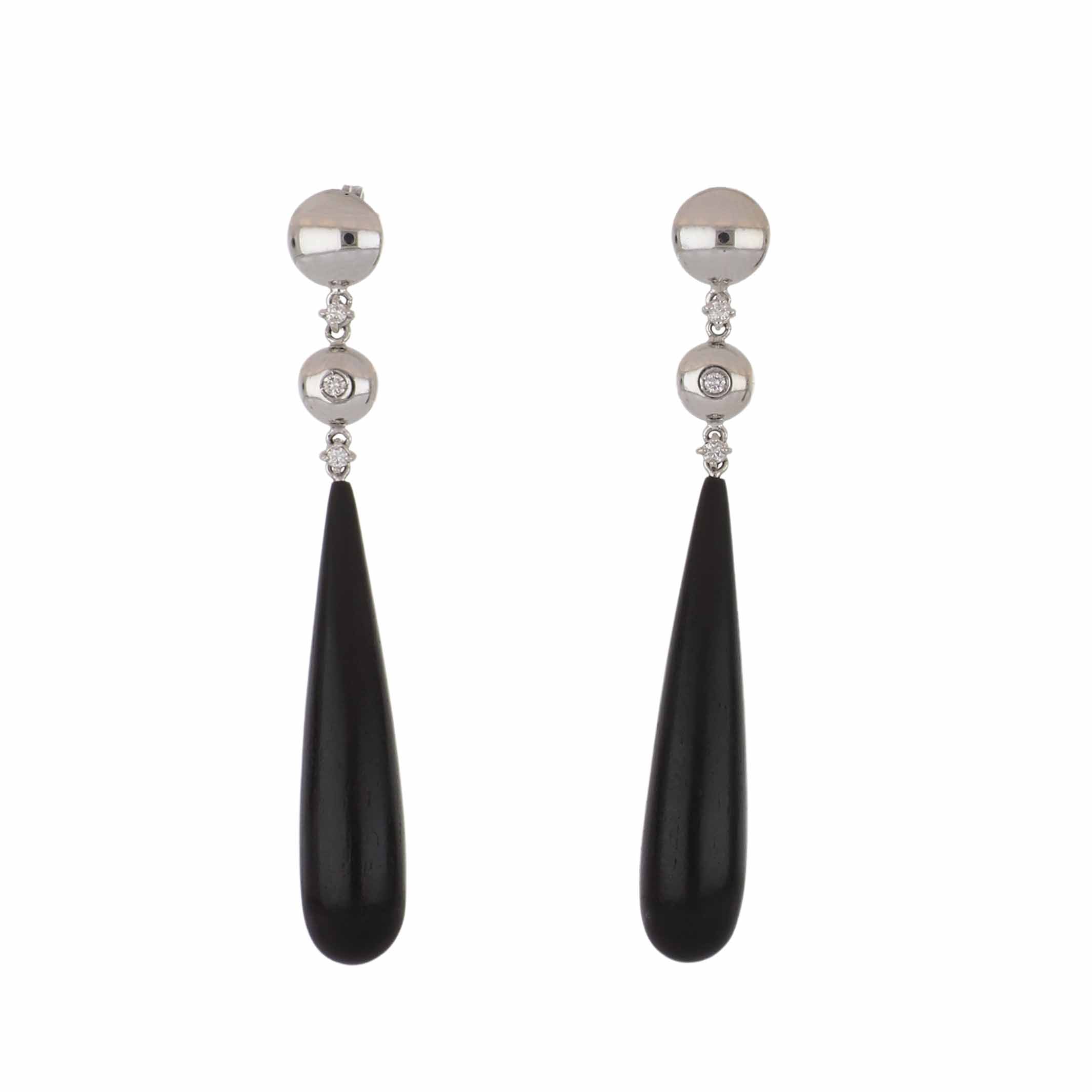 A pair of Antonio Papini 18K white gold wood drop earrings with diamonds.