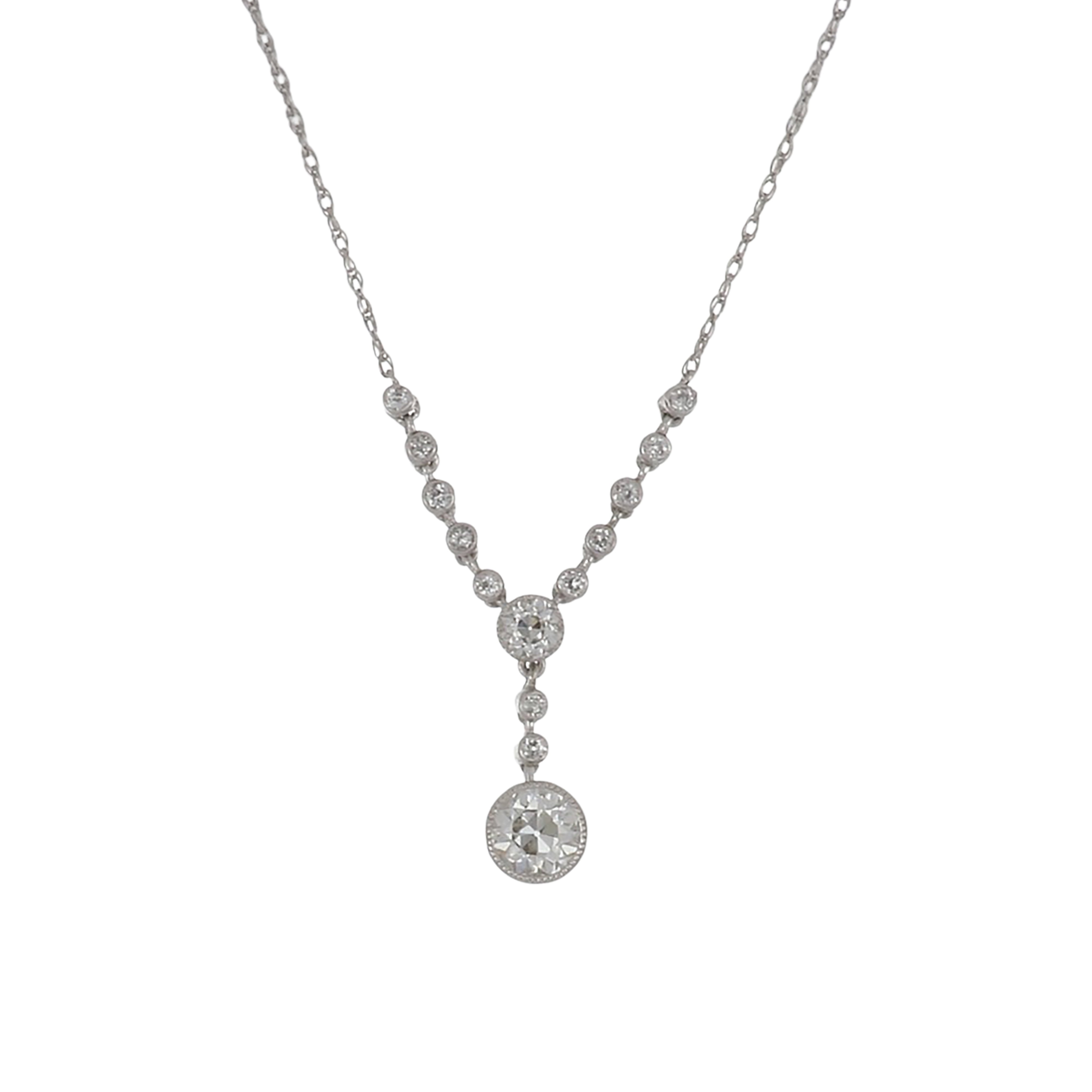 An Art Deco millegrain bezel-set Old European-cut diamond drop necklace, set in 14K white gold.