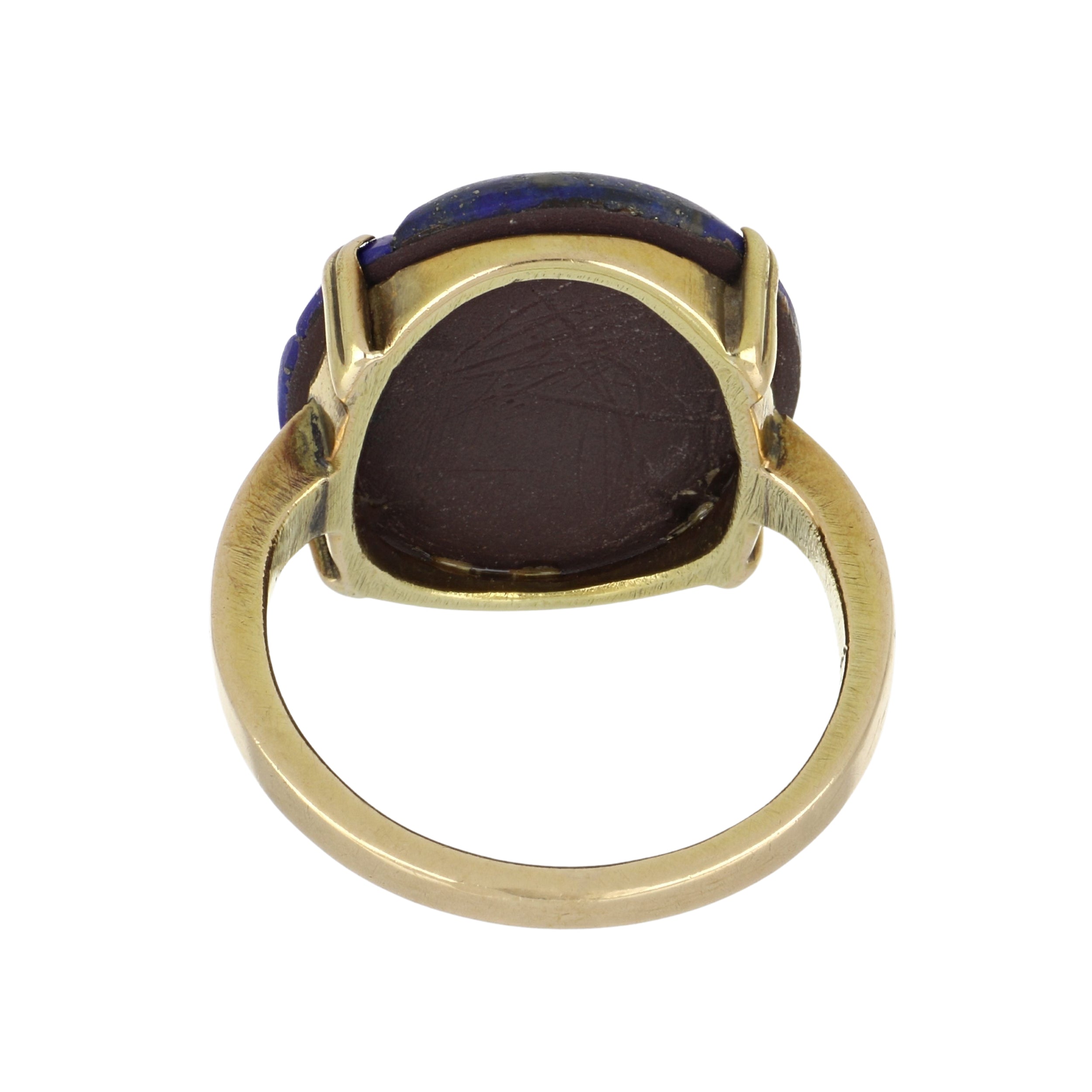 An Art Deco carved lapis ring with enamel detailing, set in 14k yellow gold. Circa 1920.Antique CollectionSize: 5.25; not sizeable