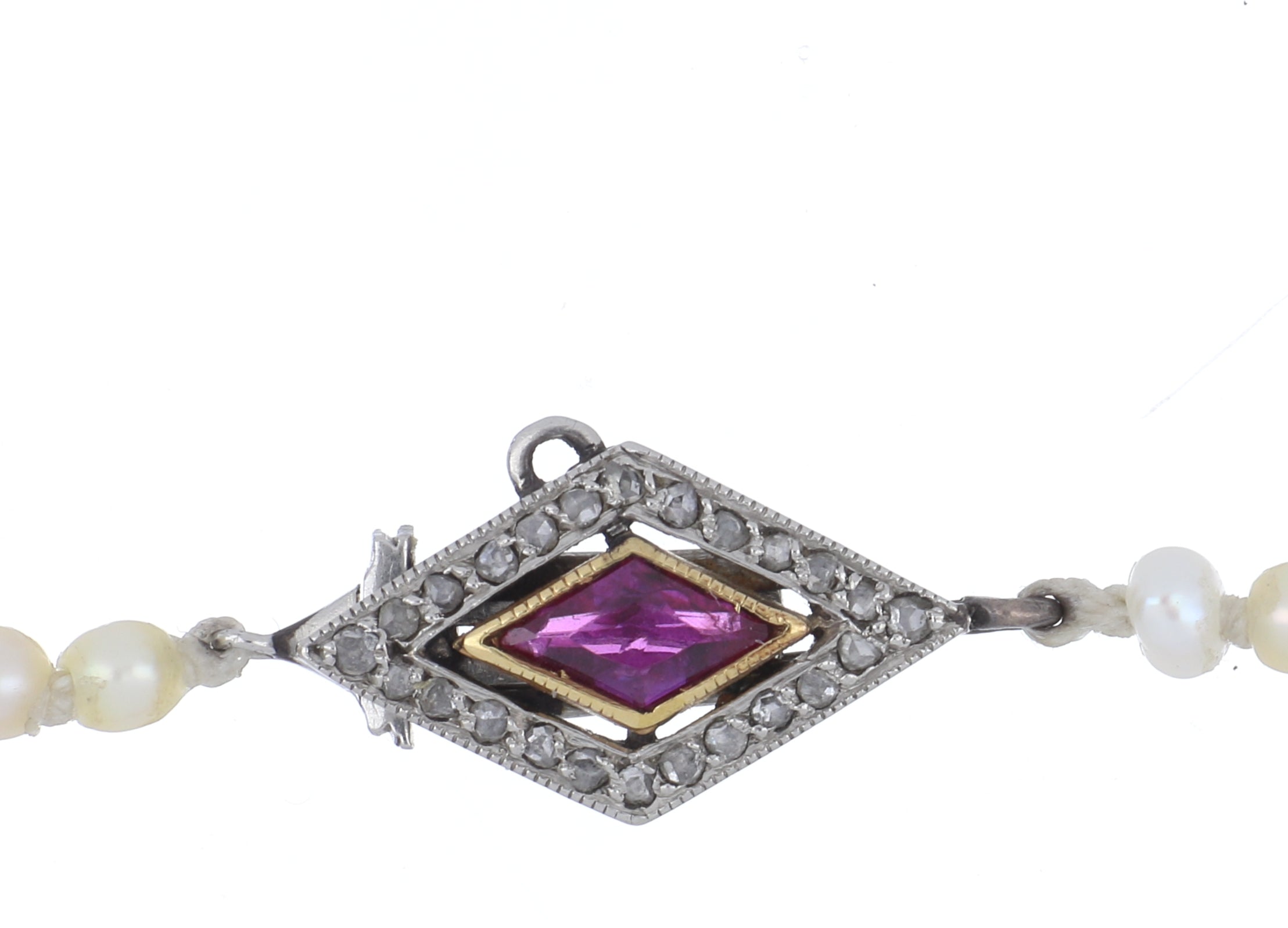 An antique cream-colored natural pearl strand, with a kite-shaped ruby and rose-cut diamond clasp, set in platinum. Late Edwardian / early Art Deco, circa 1915.