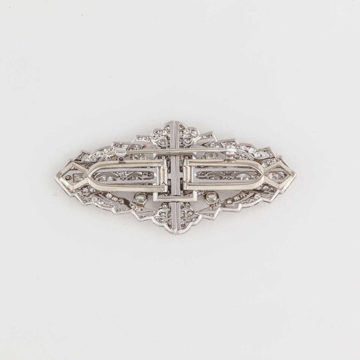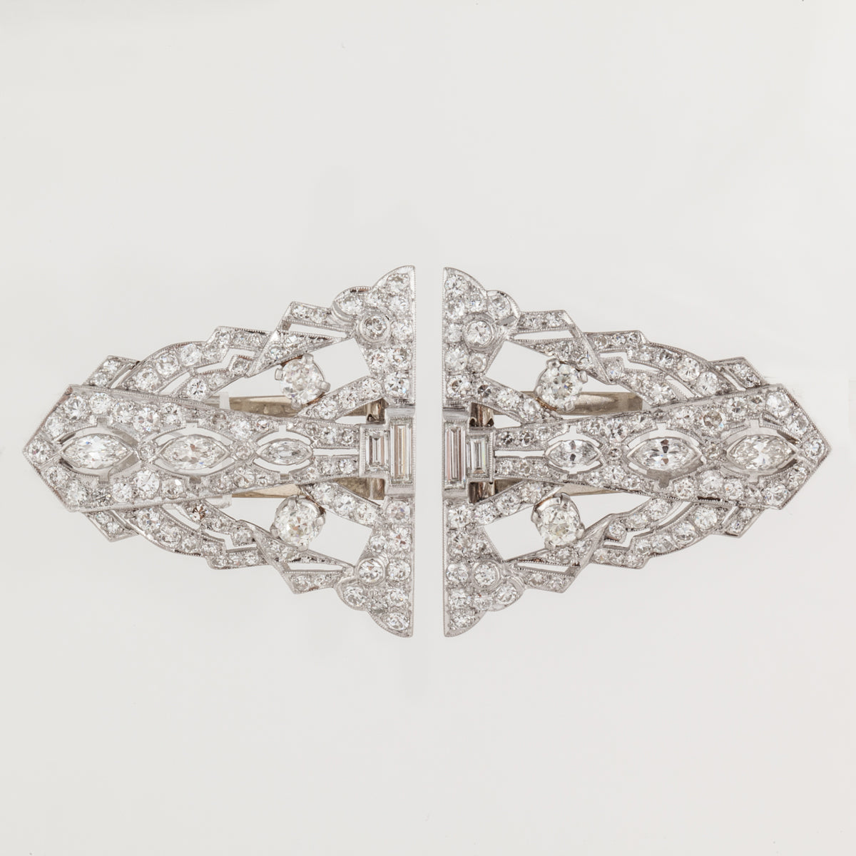 An Art Deco diamond dress clip brooch in platinum. Circa 1920.