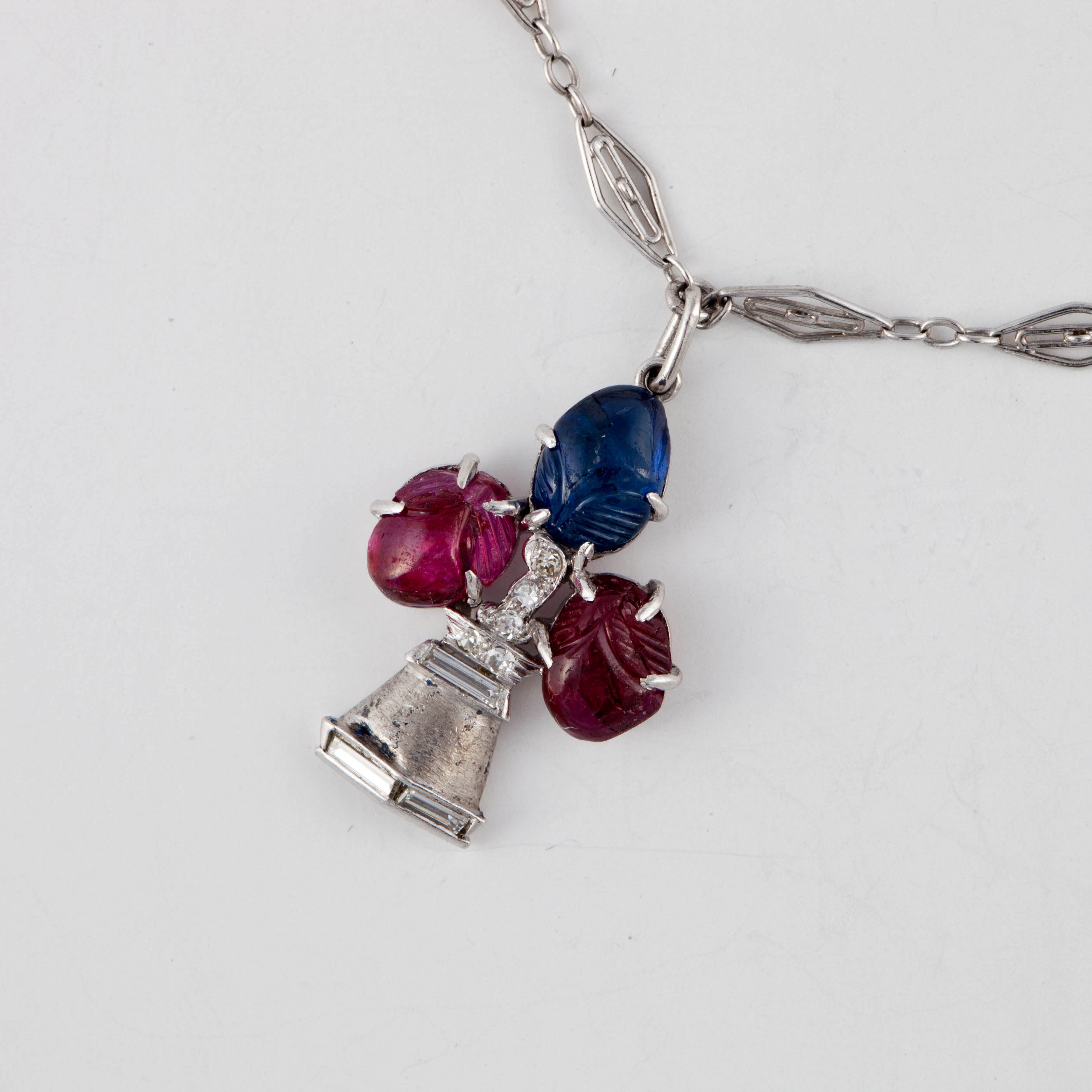 An Art Deco platinum diamond, ruby, and sapphire charm bracelet featuring a bouquet, a monkey, an elephant, and a puppy. Circa 1920.