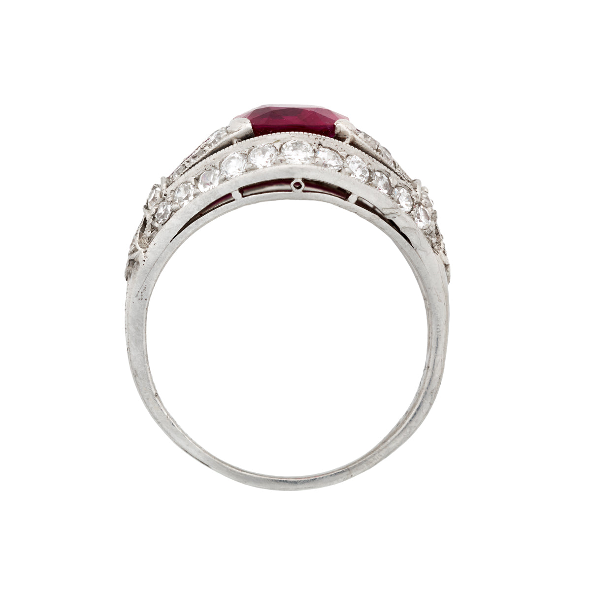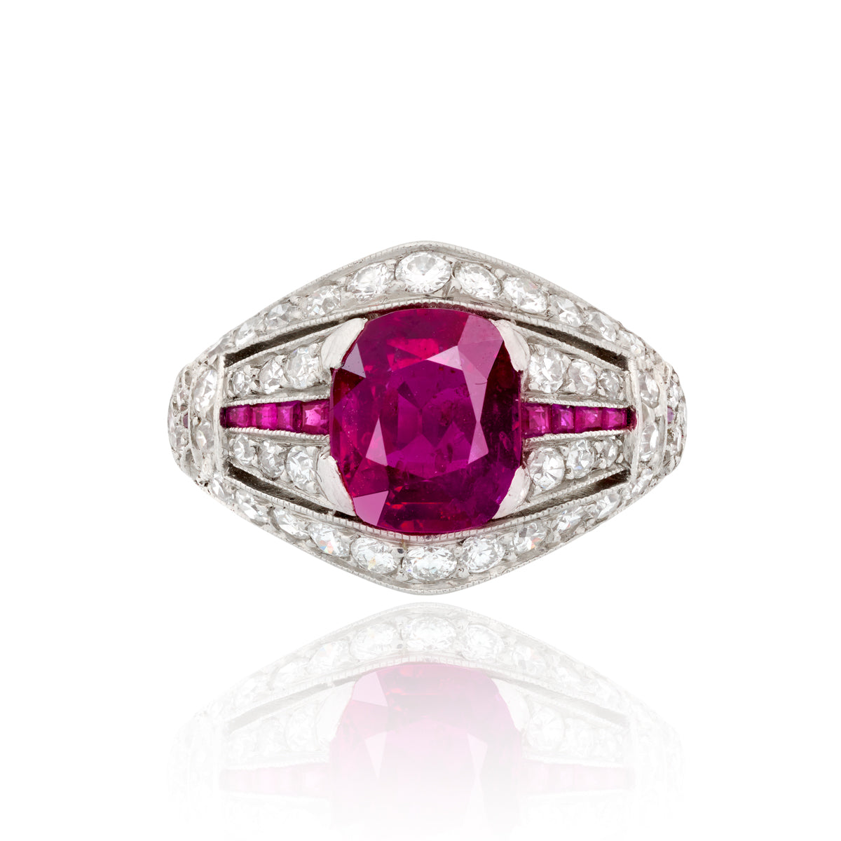 An Art-Deco cushion-cut burmese ruby ring with single-cut round diamonds and calibre-cut rubies, set in platinum. Circa 1920.