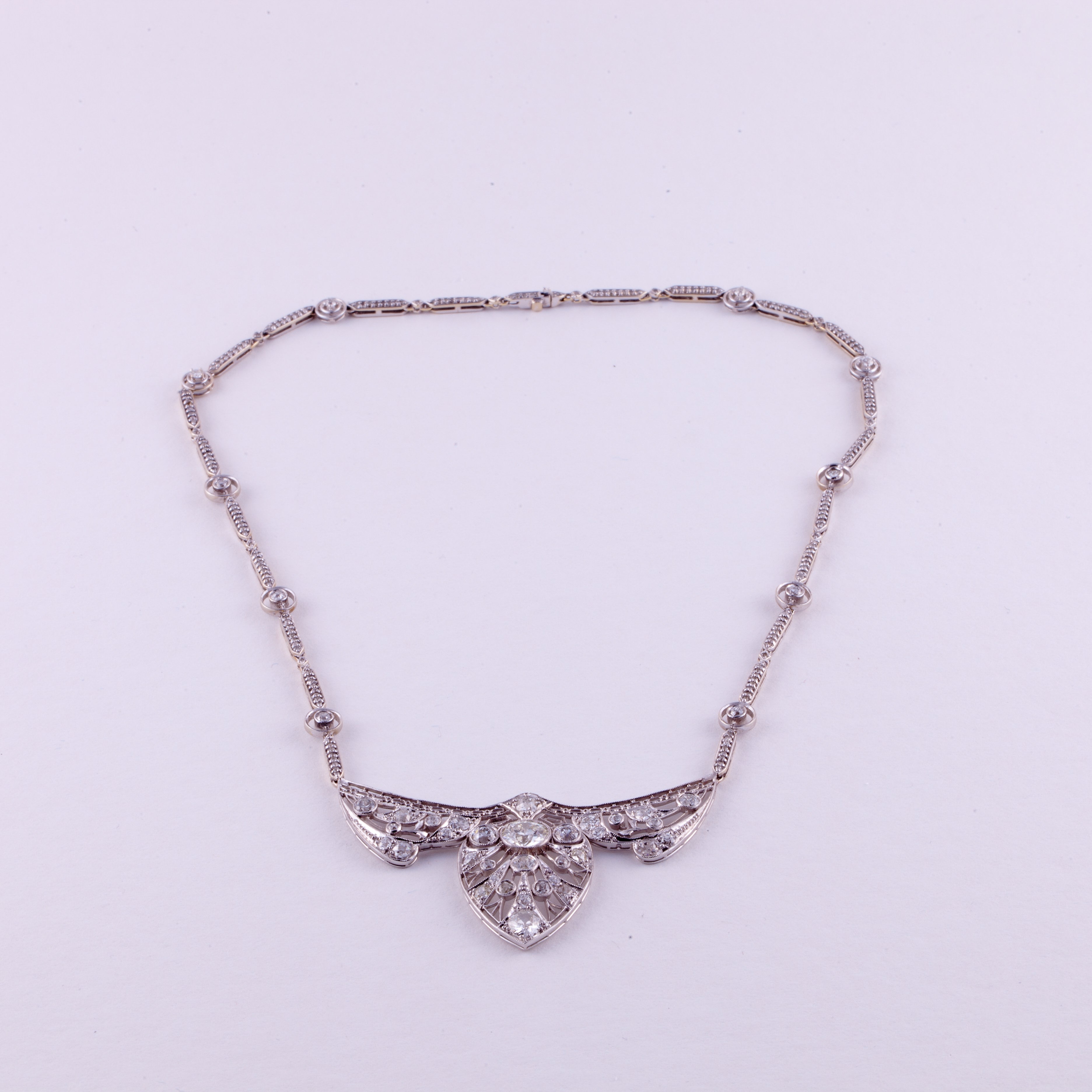 An Art Deco station necklace with an Old European-cut diamond plaque pendant, set in platinum. Circa 1910.