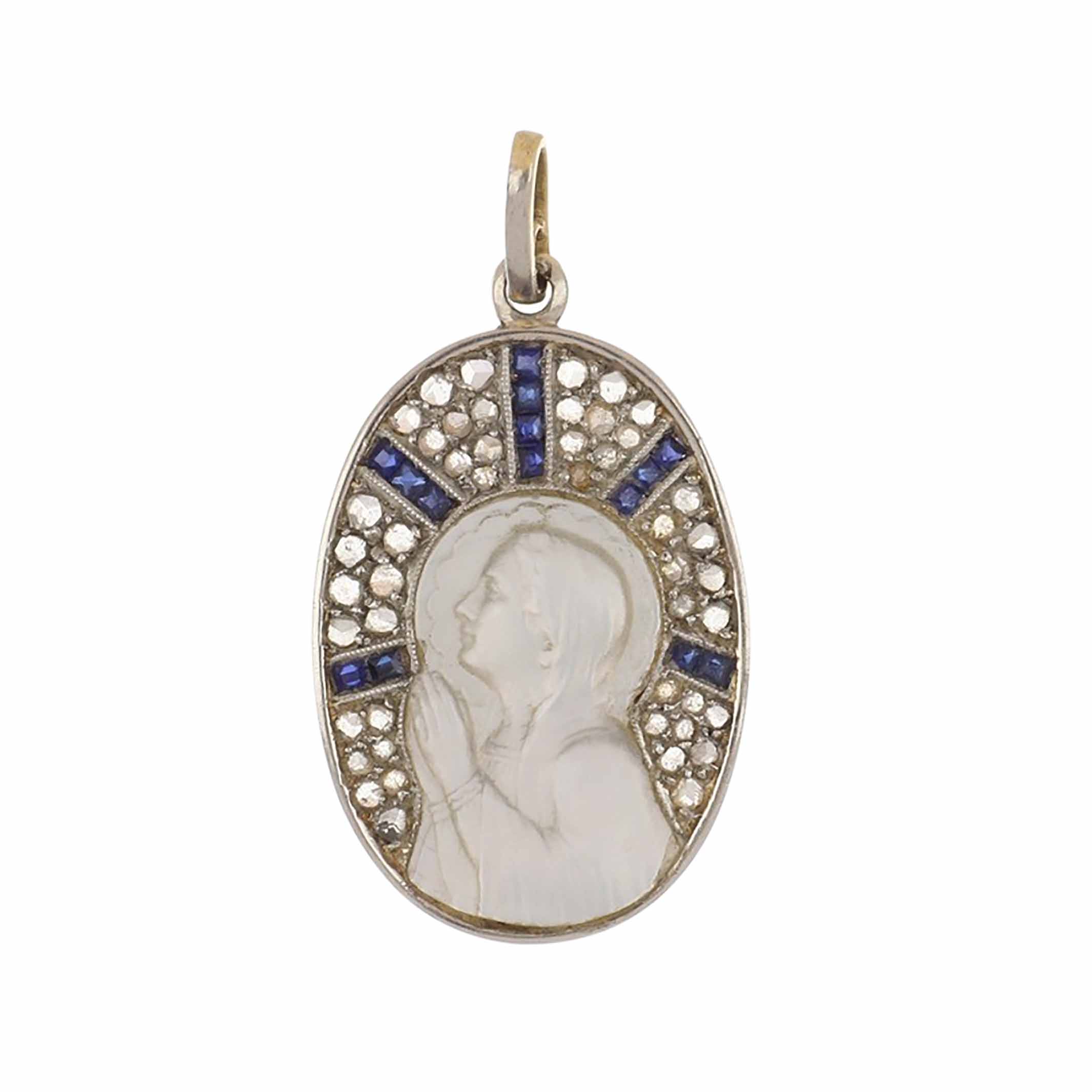 An Art-Deco carved mother-of-pearl Virgin Mary depiction pendant set with calibre-cut sapphires and rose-cut diamonds in platinum and 18K yellow gold. Pendant has "Teresa V-X-1925" engraved on the back side. Circa 1925.