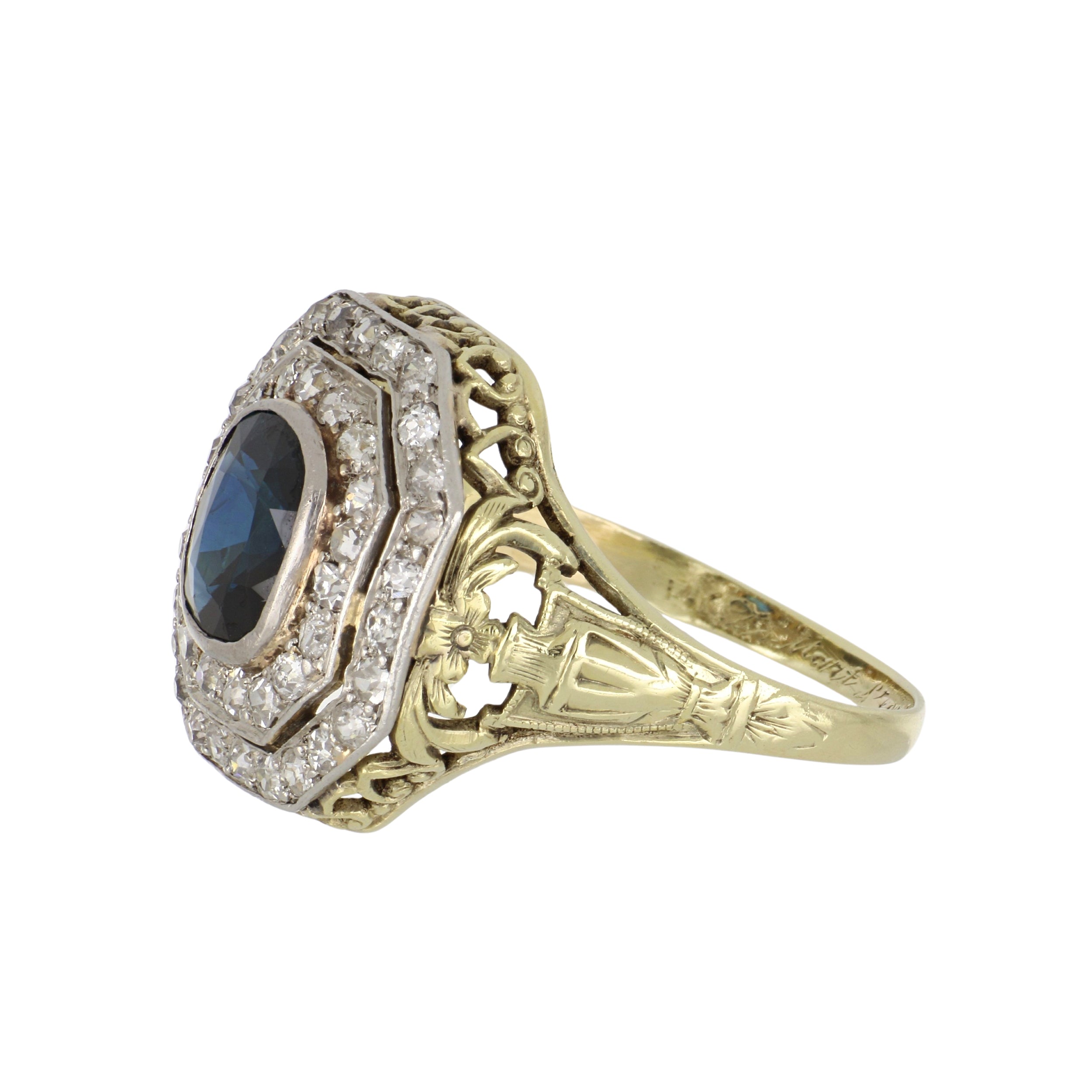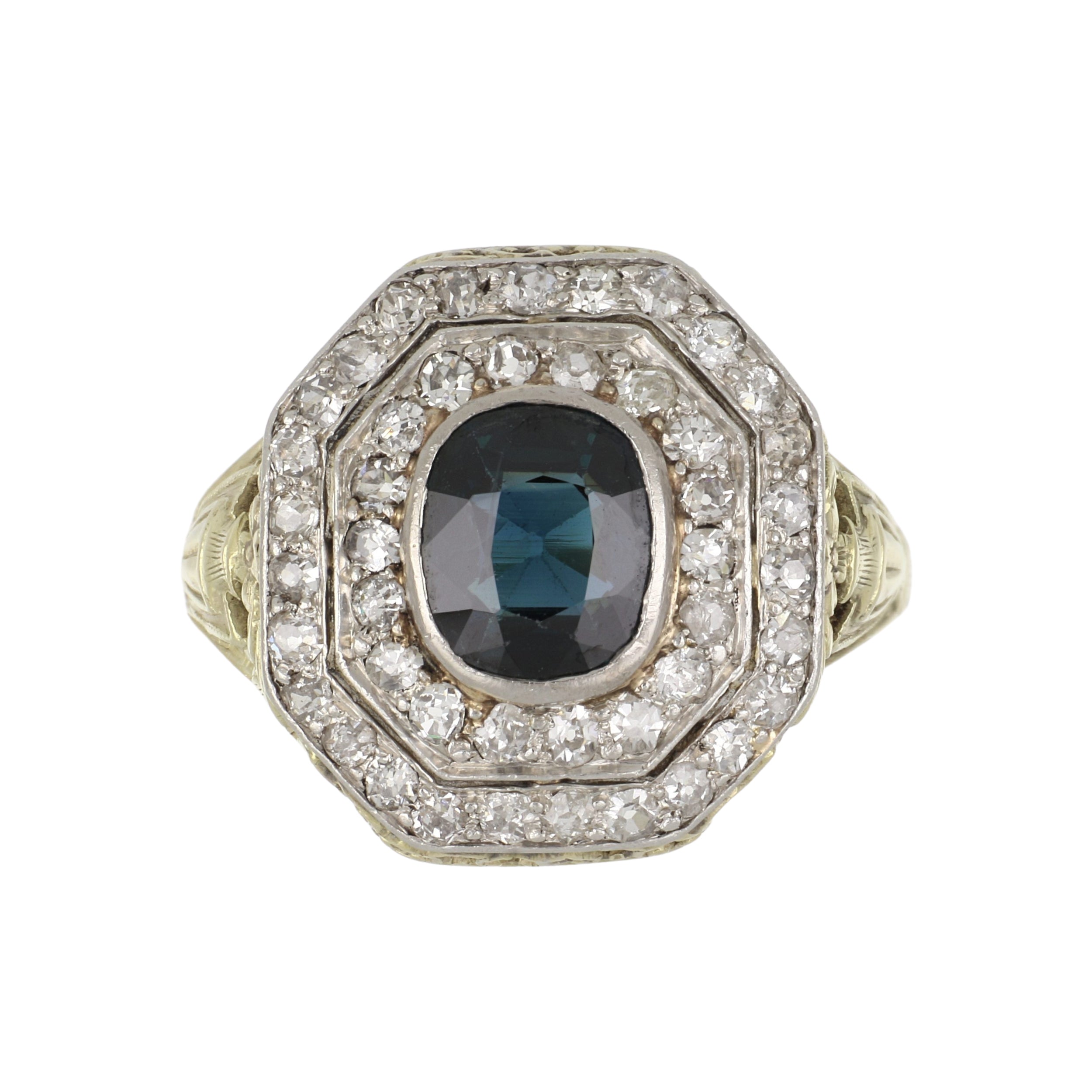 An Art Deco platinum topped 18 karat yellow gold sapphire & diamond target ring with urn motif at shoulders. Dated 1927.