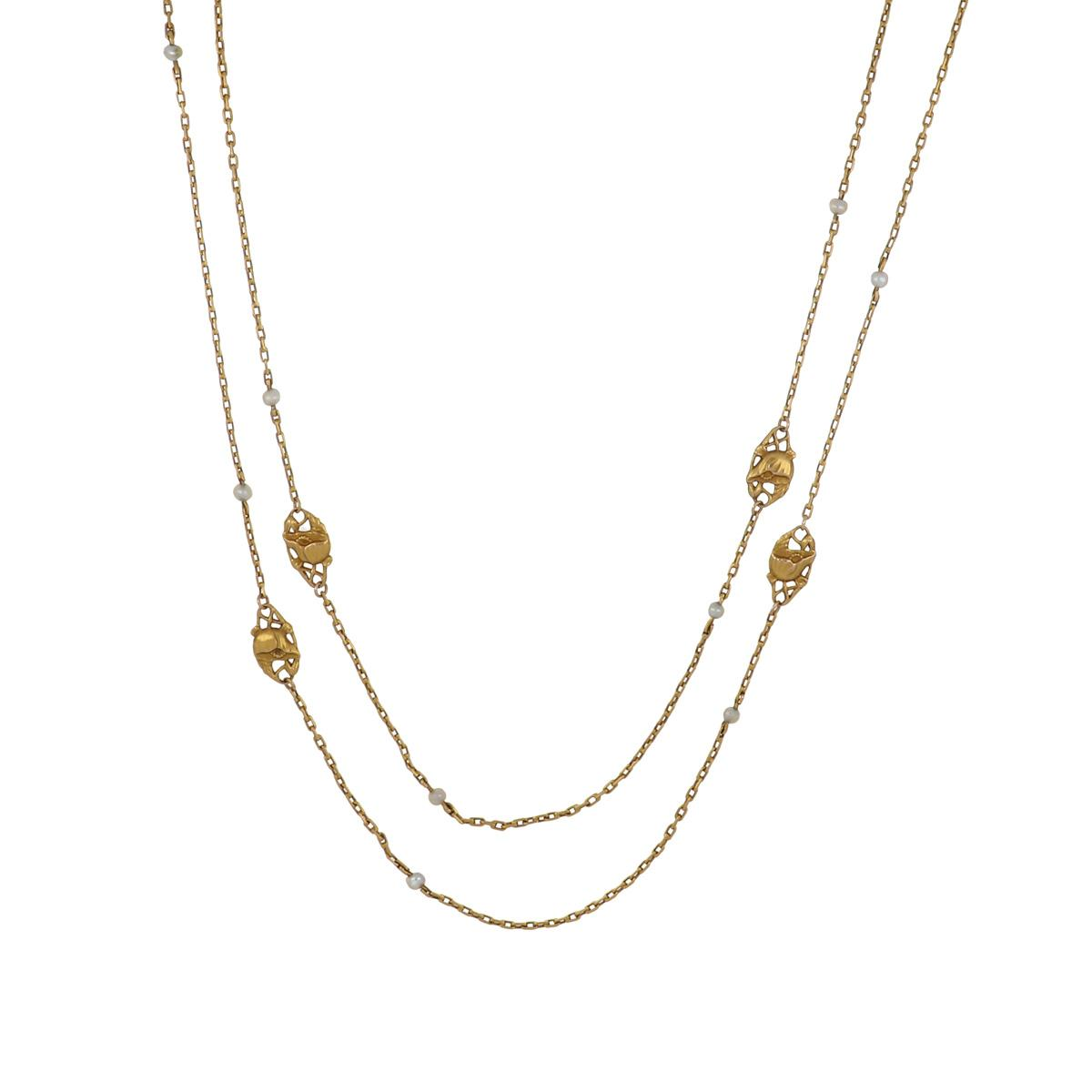 An antique Art Nouveau 18K yellow gold longuard chain with pearls and openwork floral stations. French, circa 1900.